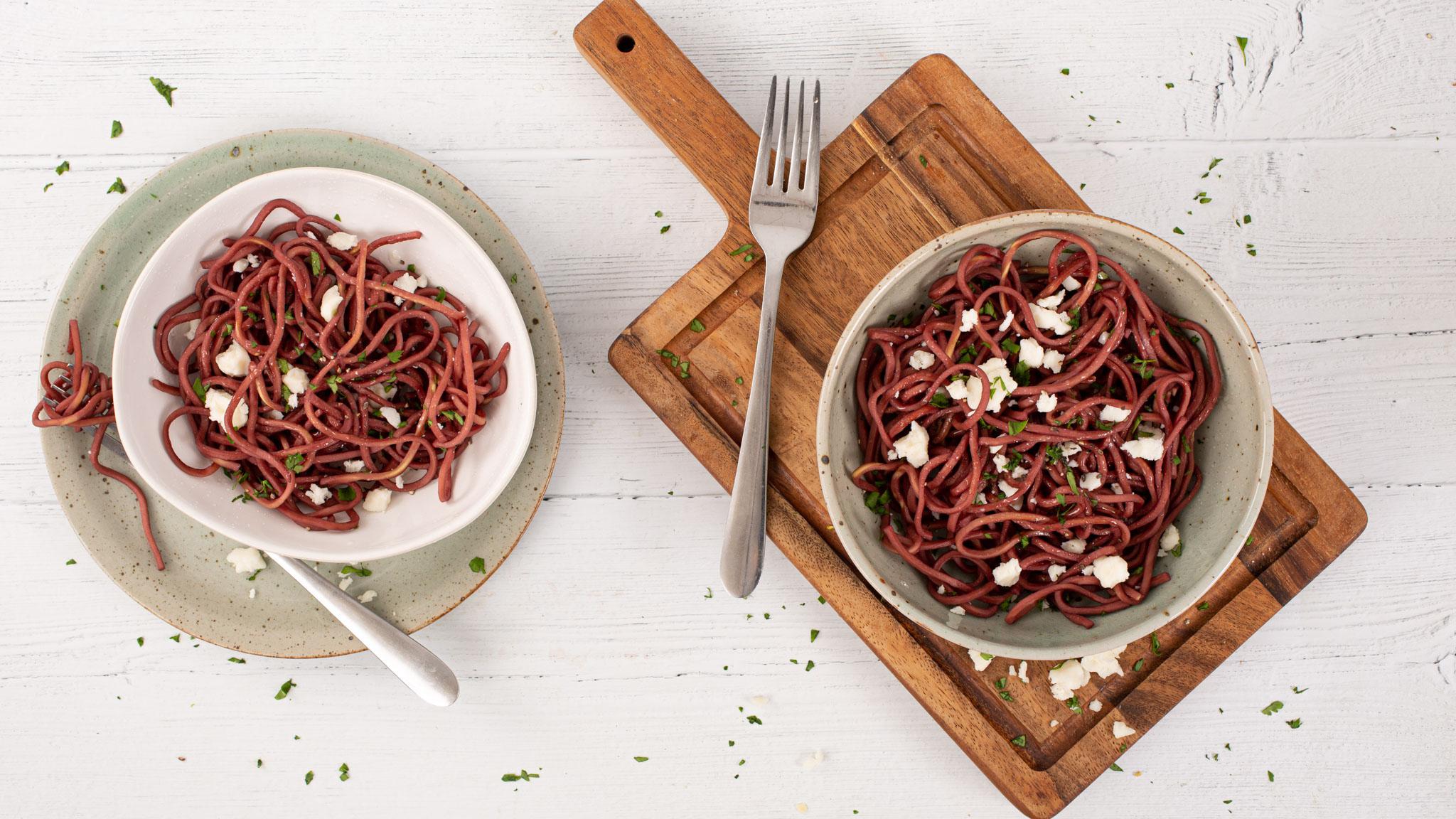 Cooking pasta in red wine might seem a little odd but the wine gives the pasta a great colour.