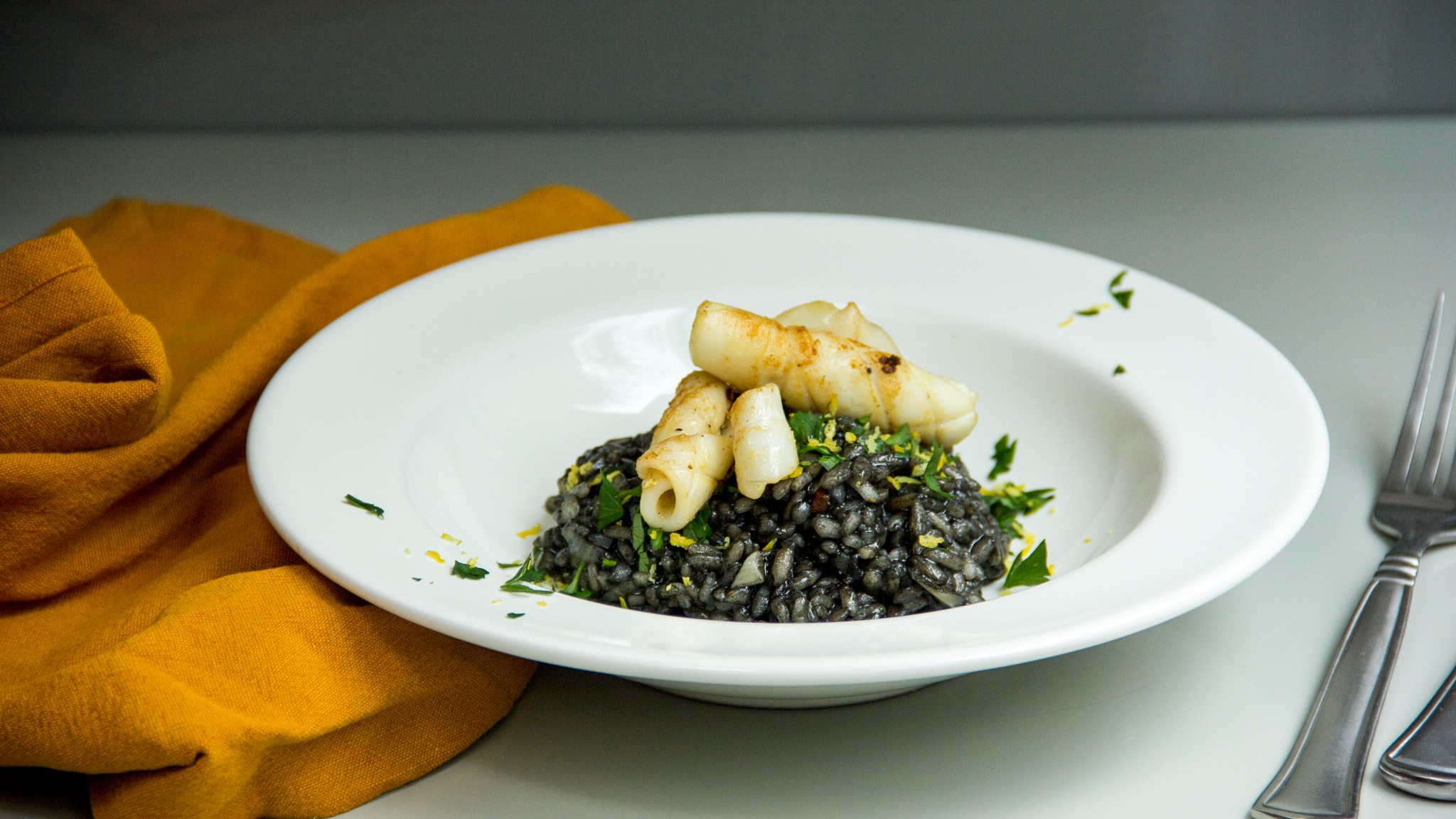 Originally from Venice this dish would often use cuttlefish ink to give it its distinctive black colour, our recipe uses squid ink and is served garnished with lemon, garlic and parsley then topped with pan seared squid.