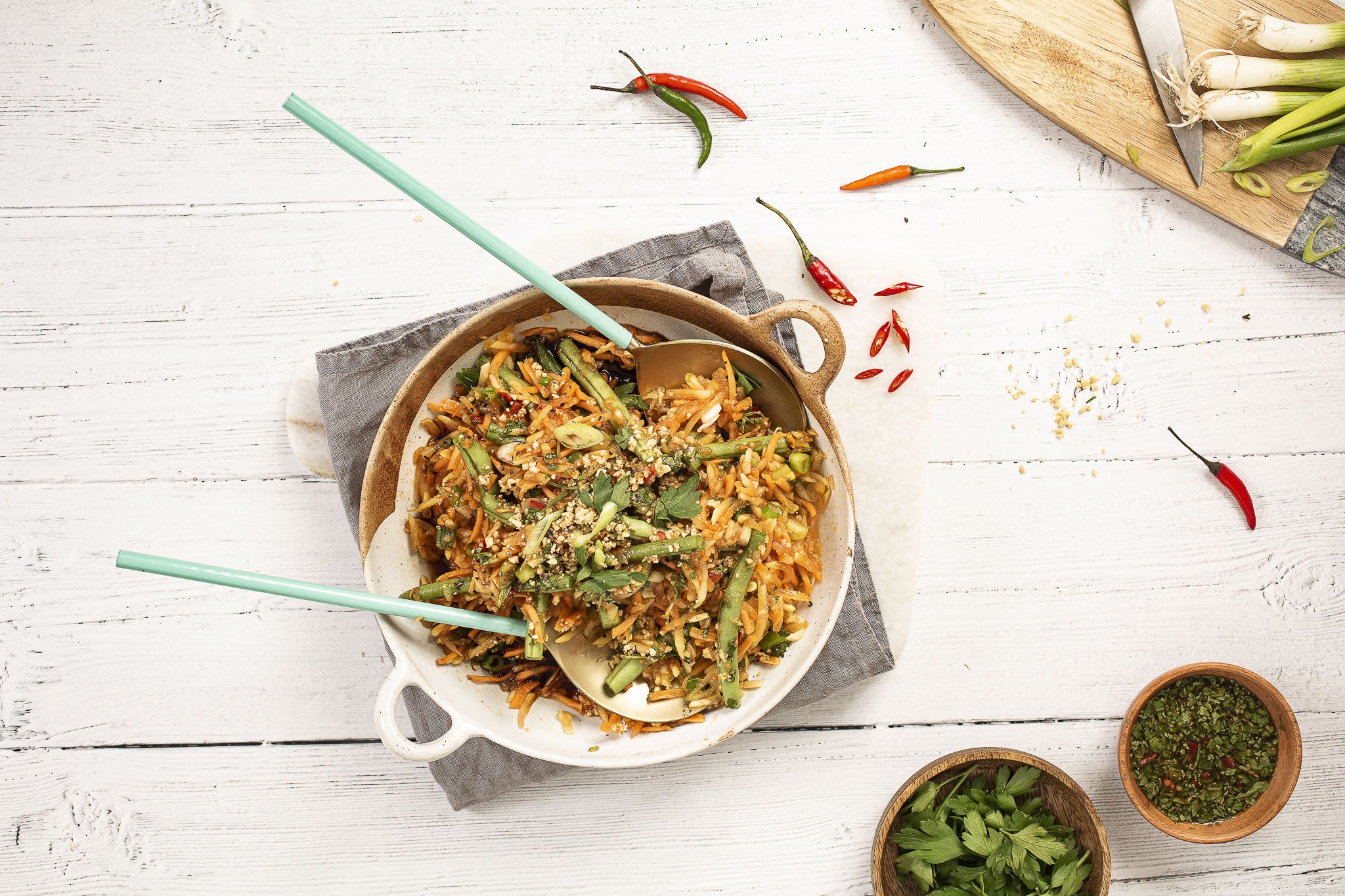 This is a vibrant, fresh salad from Thailand topped with chopped roasted peanuts.