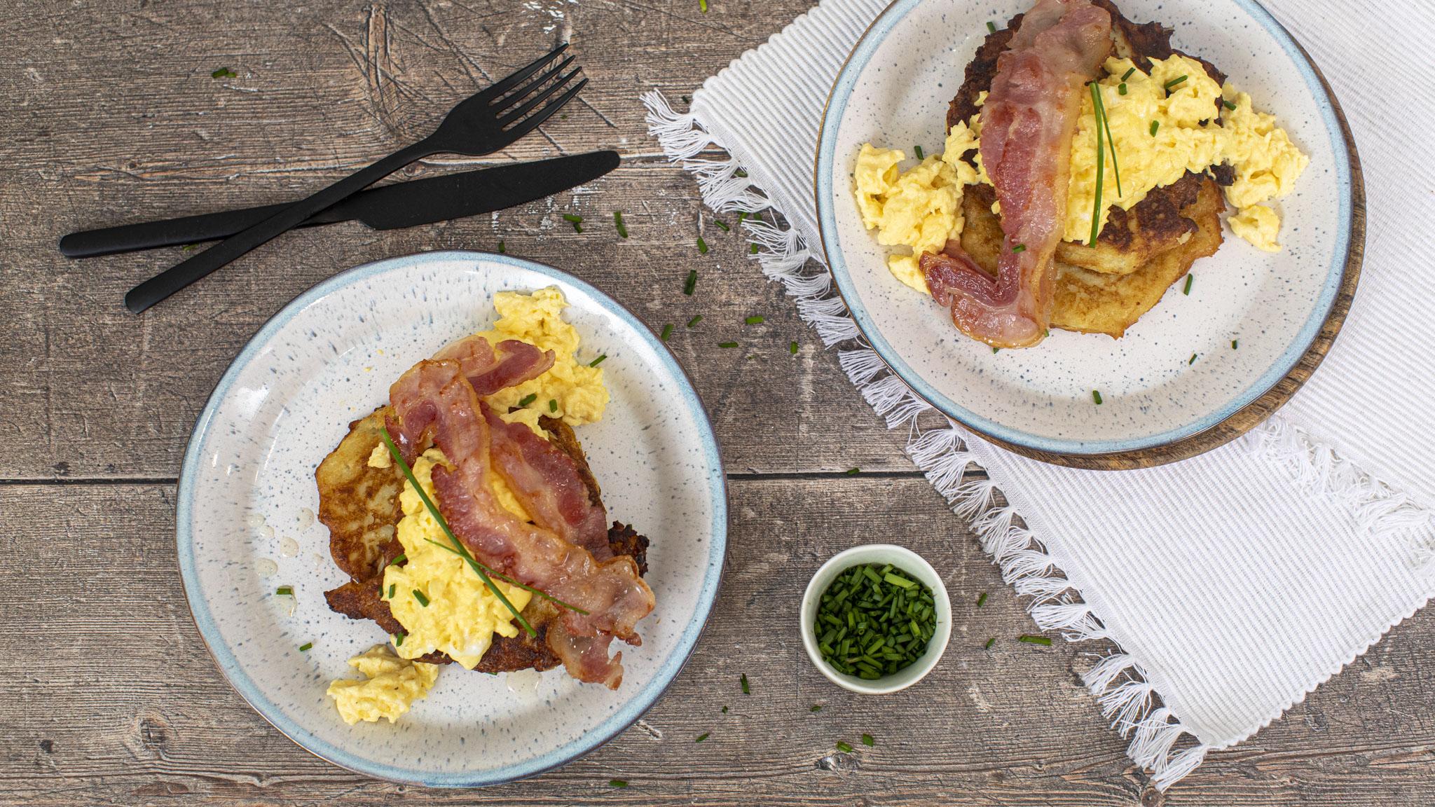 Potato pancakes can be served for breakfast with scrambled eggs and bacon, or with poached eggs and garnished with chopped chives.