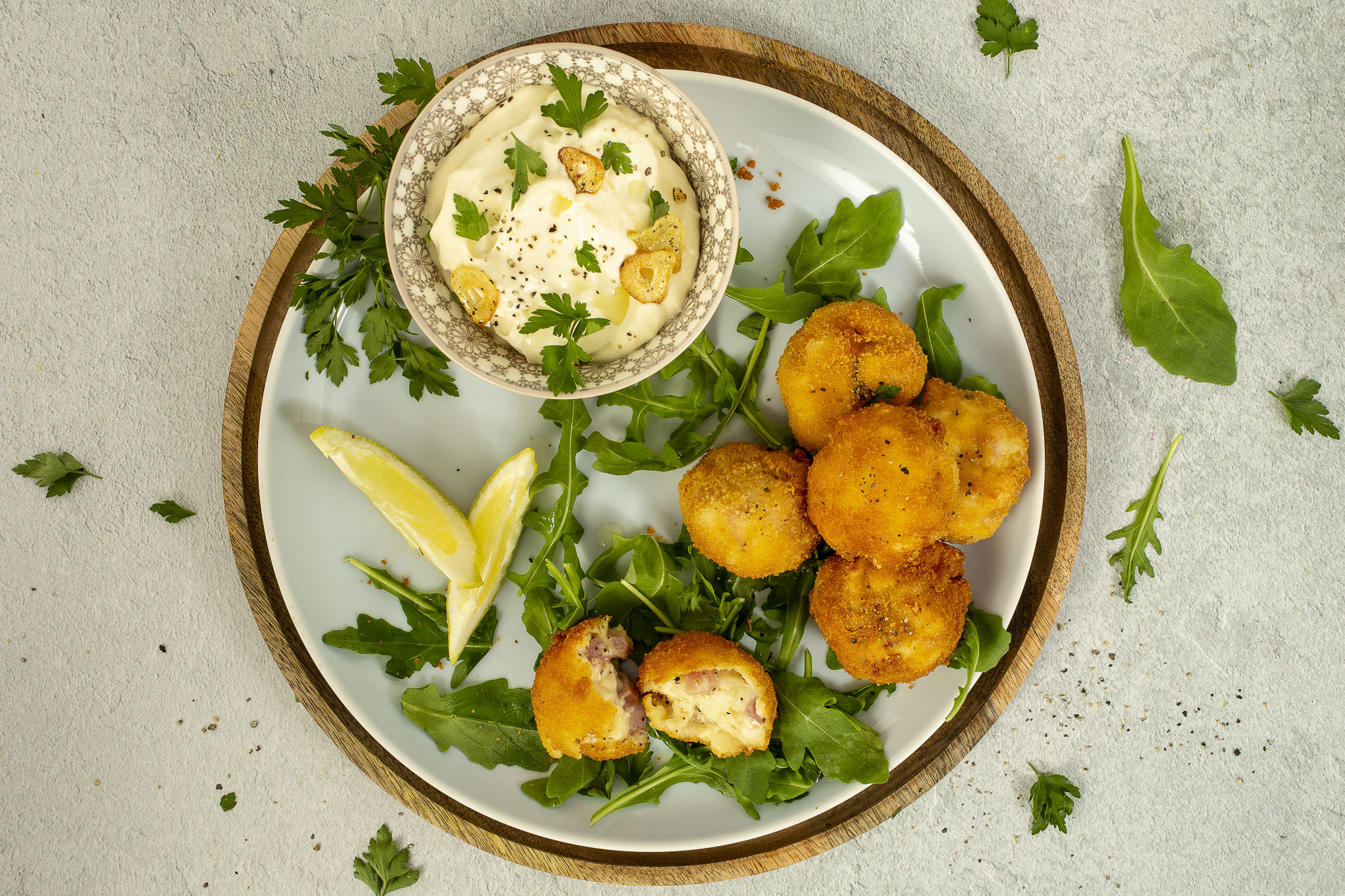 These crisp, golden brown bites have a creamy white sauce & ham filling .