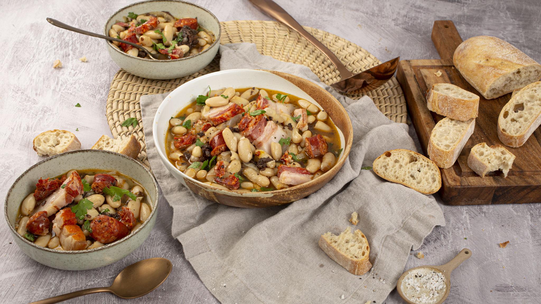 This is a hearty stew from the mountains of Asturias in northern Spain. Its main ingredients are white Asturian butter beans, chorizo, black pudding and a chunk of salty pork belly.
