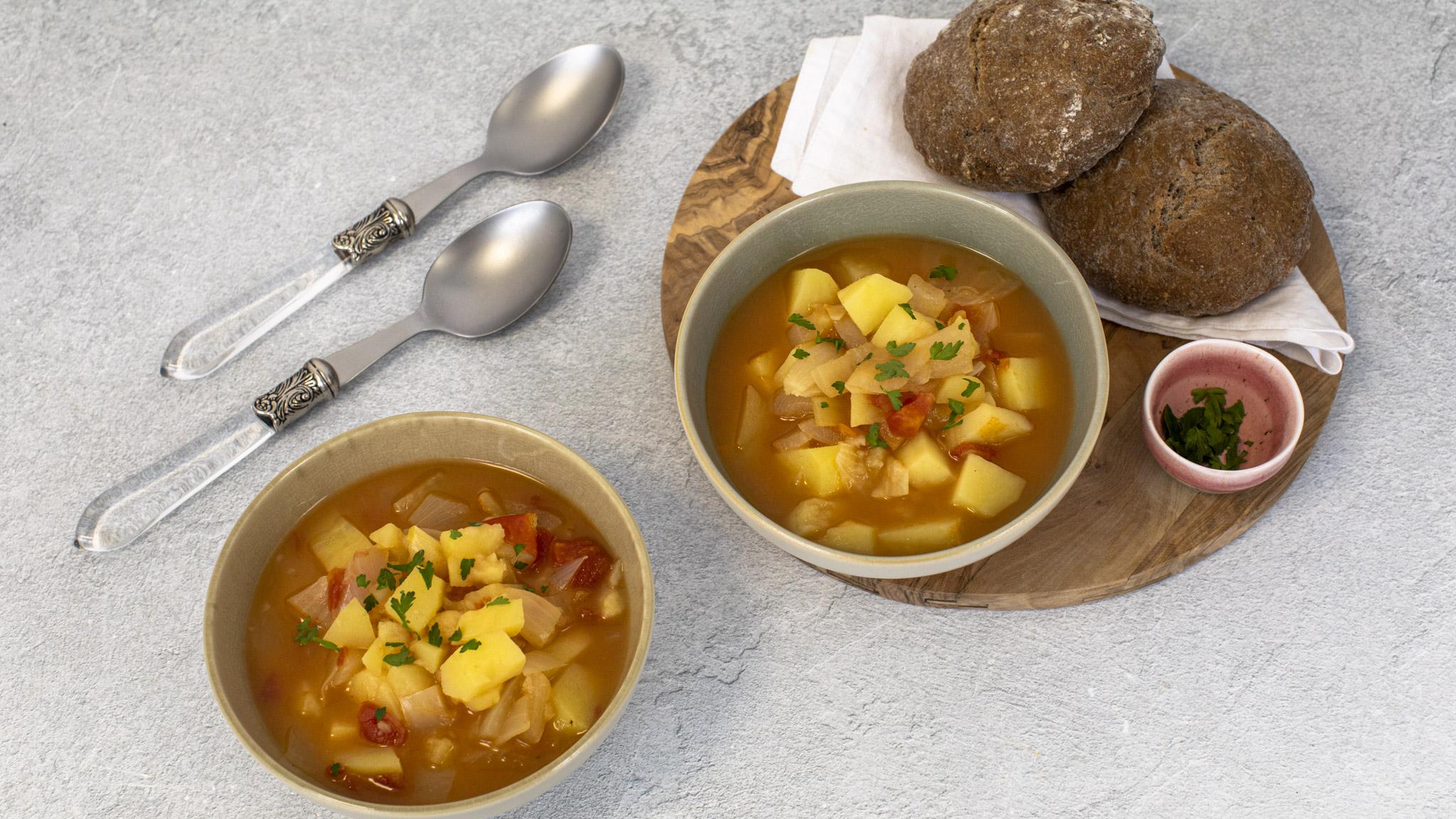 A simple soup with six ingredients which can be garnished with cooked ham for added flavour and texture.