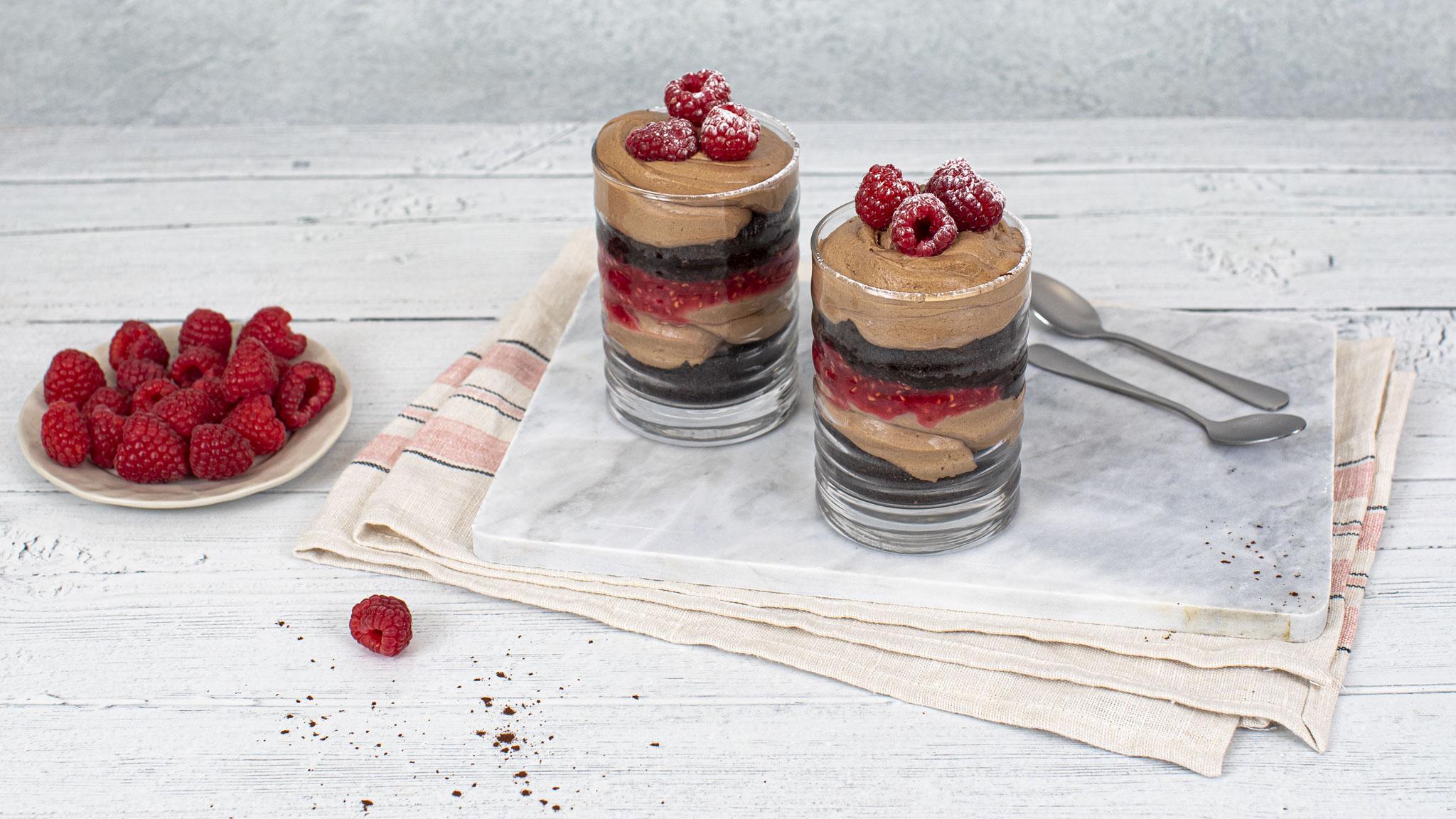 A delicious dessert that is beautifully layered with crushed chocolate biscuits, coffee and chocolate cream and a raspberry puree.