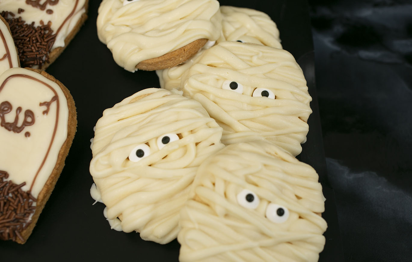 These Mummy Biscuits will be the treat at your Halloween party. To decorate these biscuits you can buy pre-made candy eyes or use white sugar paste.