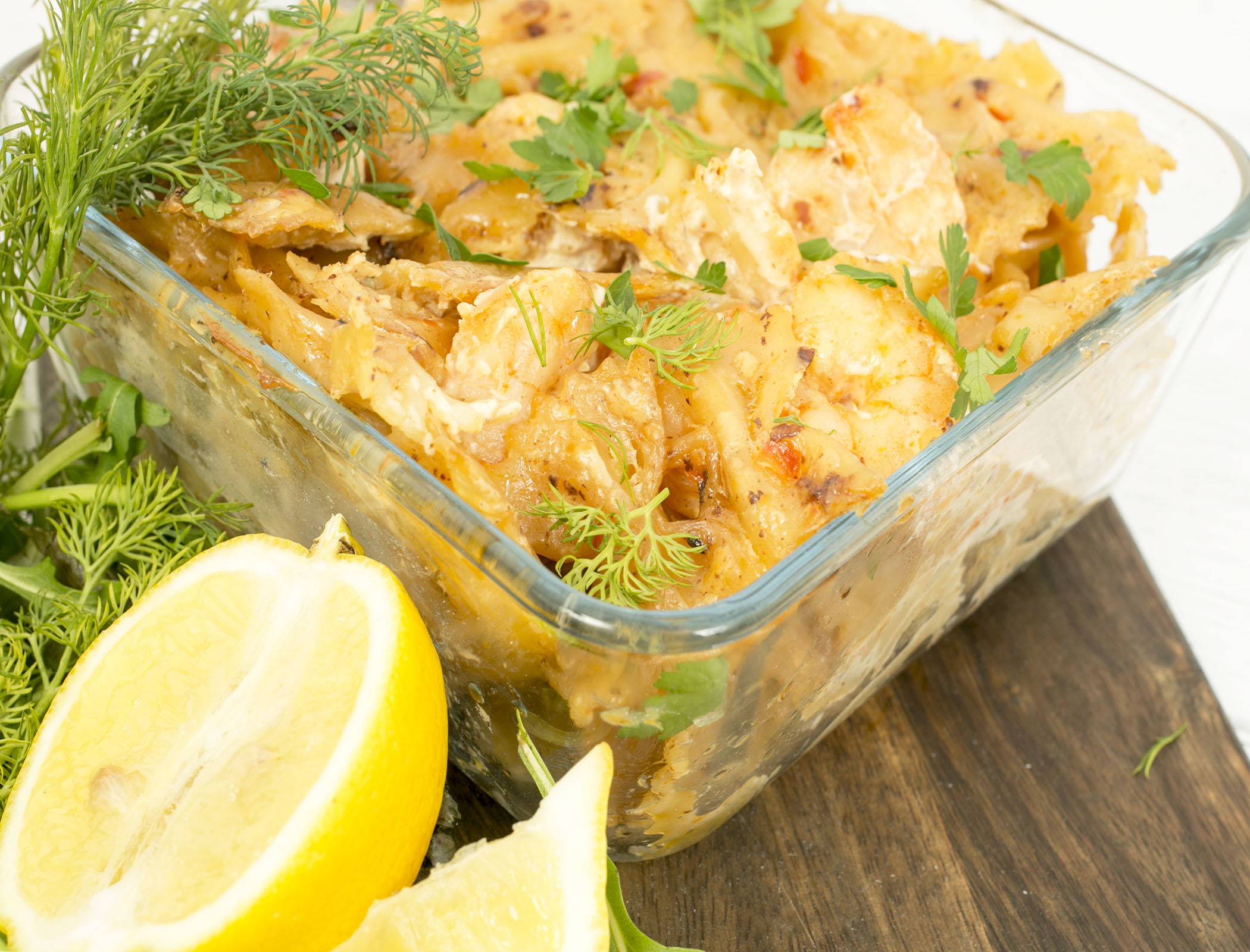 A simple dinner for two, enjoy this creamy prawn pasta bake with a side salad.