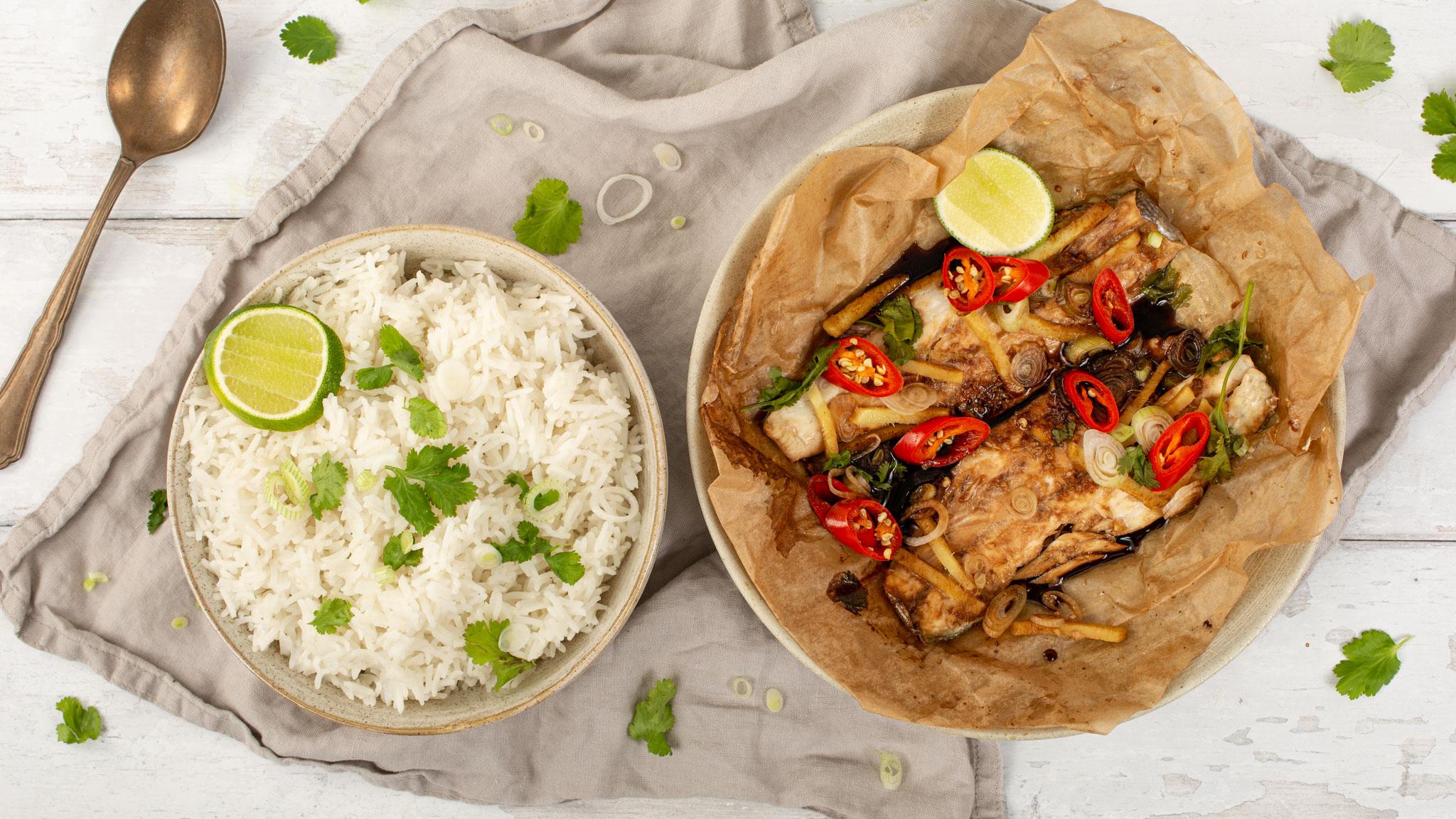 This is a fresh and fragrant meal for 2, using the steamer basket to perfectly cook fish and make coconut rice at the same time.