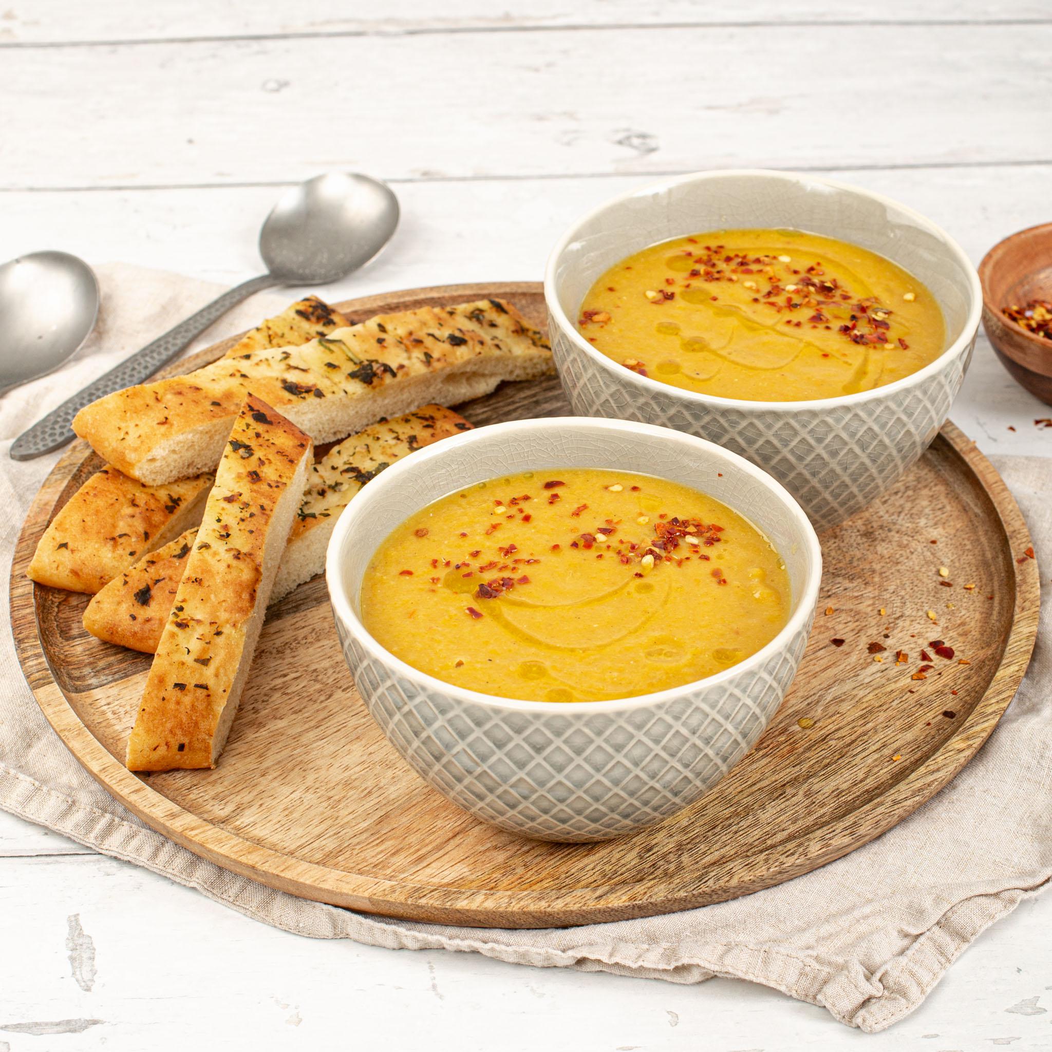 A warming soup serve with naan bread and a sprinkling of dried chilli flakes. If you prefer a smooth soup just blend before serving using the ThermoResist Glass blender or a hand blender.