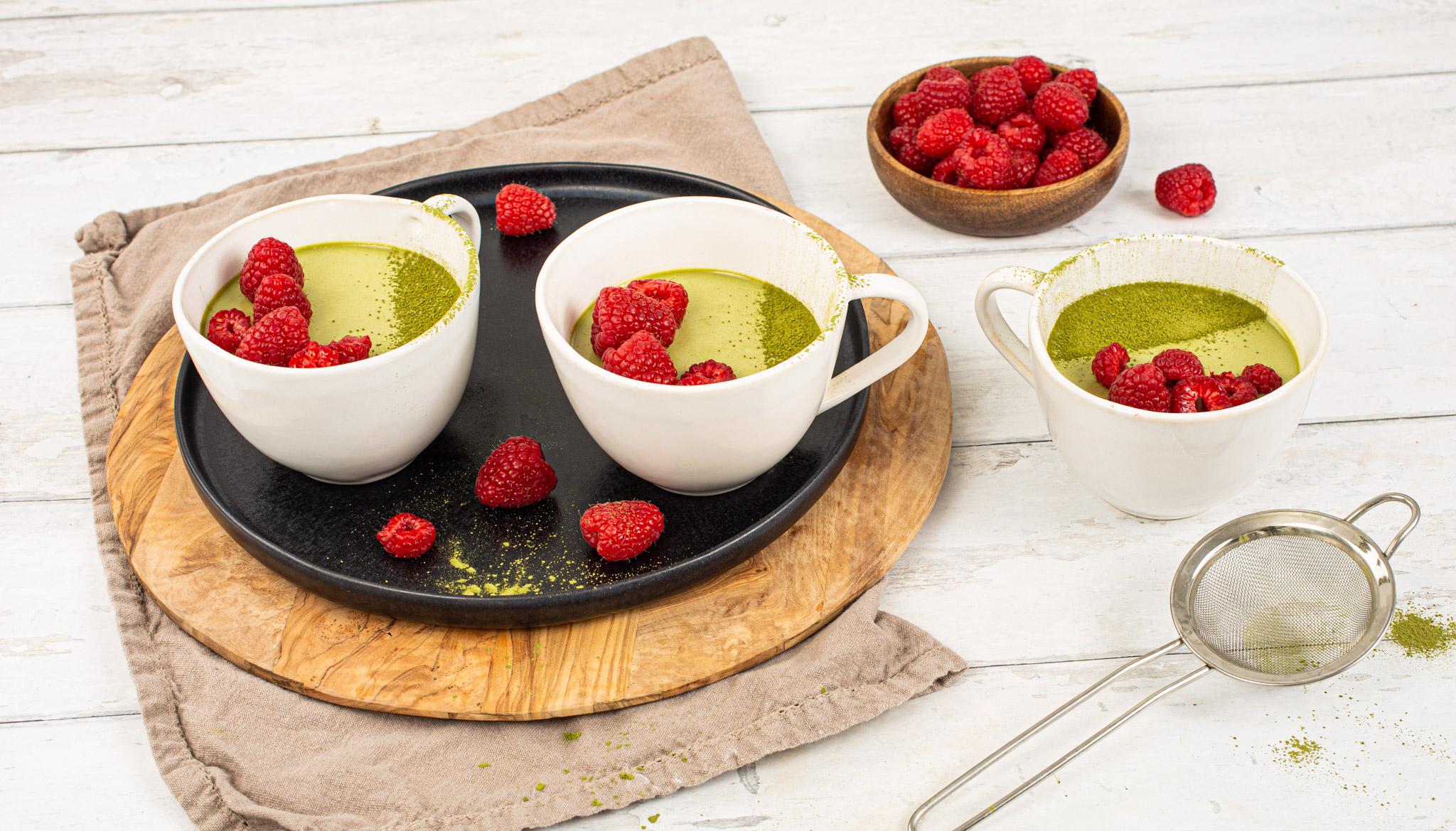 An impressive, but simple dessert, serve with raspberries and an extra sprinkling of matcha. You can either serve in the container or turn out onto a plate – make sure you oil the container if you wish to do this.