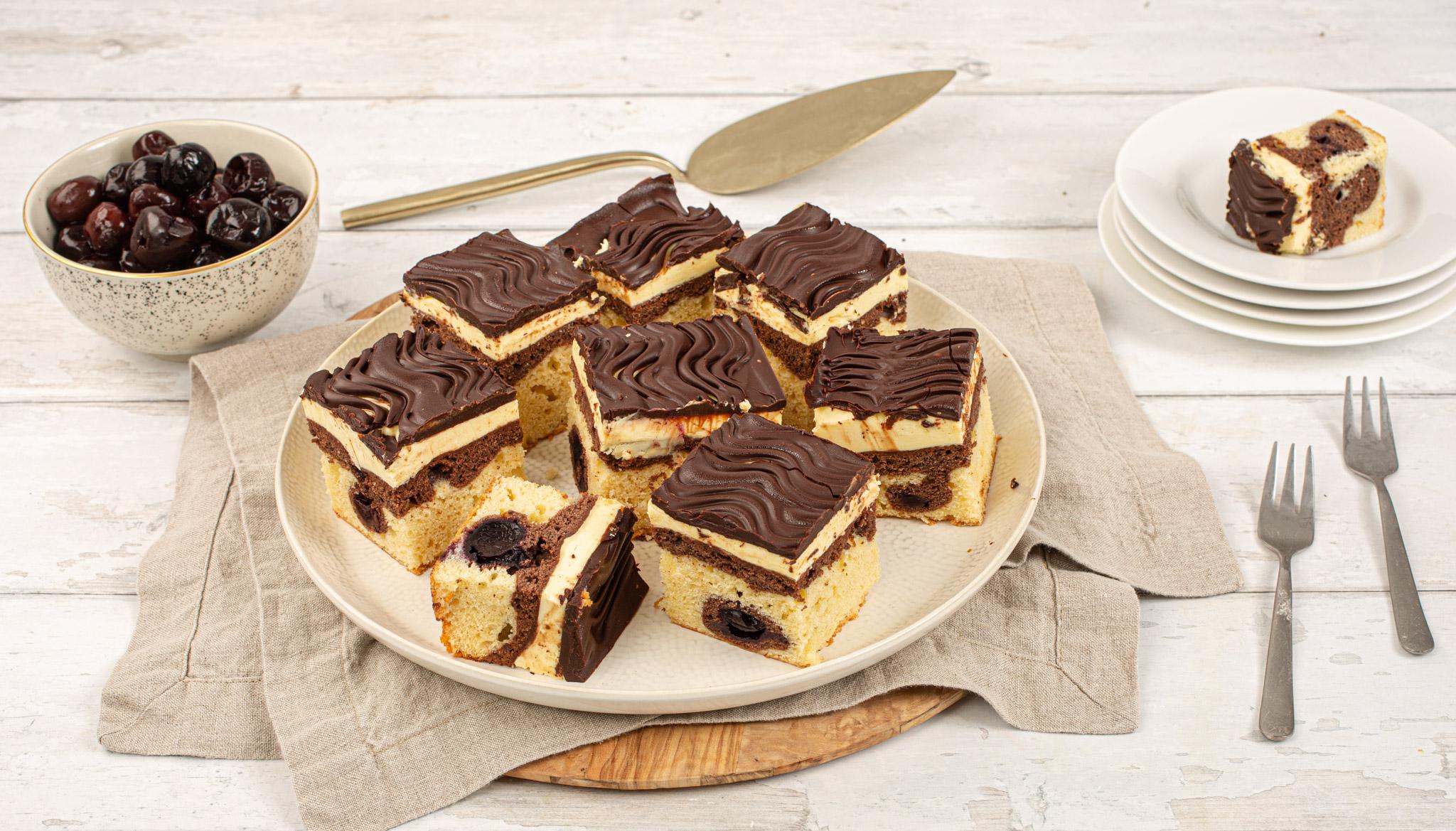 A delicious layered vanilla and chocolate cake with cherries, vanilla buttercream and wave pattern chocolate topping.