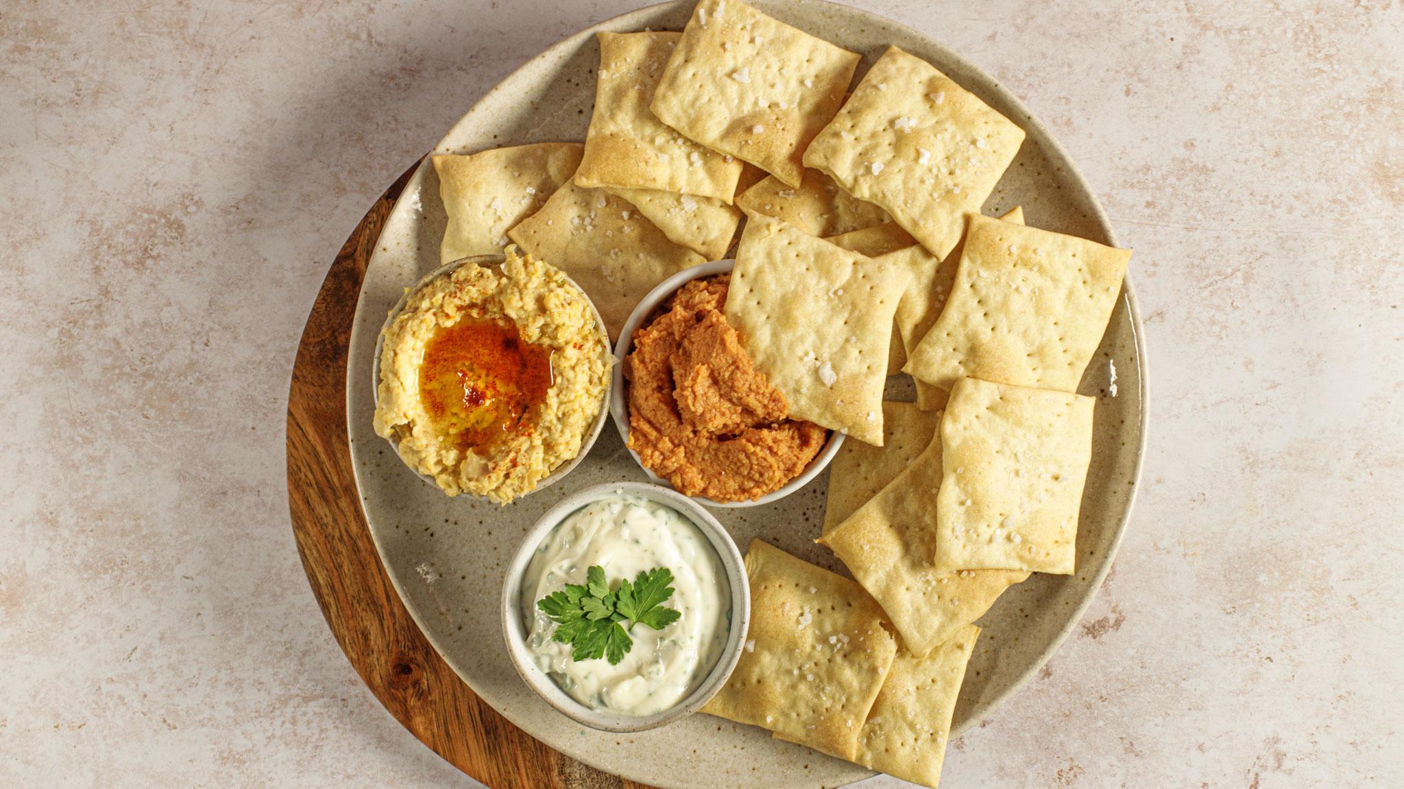 Light, crispy homemade crackers make a welcome addition to cheese boards or can be served as a healthy snack with hummus. Be creative with shapes and try adding toppings like seeds and ground spices.