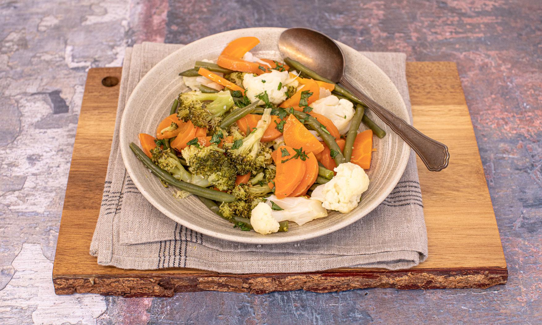 Basic steamed vegetables to serve with your main meal. Top with fresh herbs.