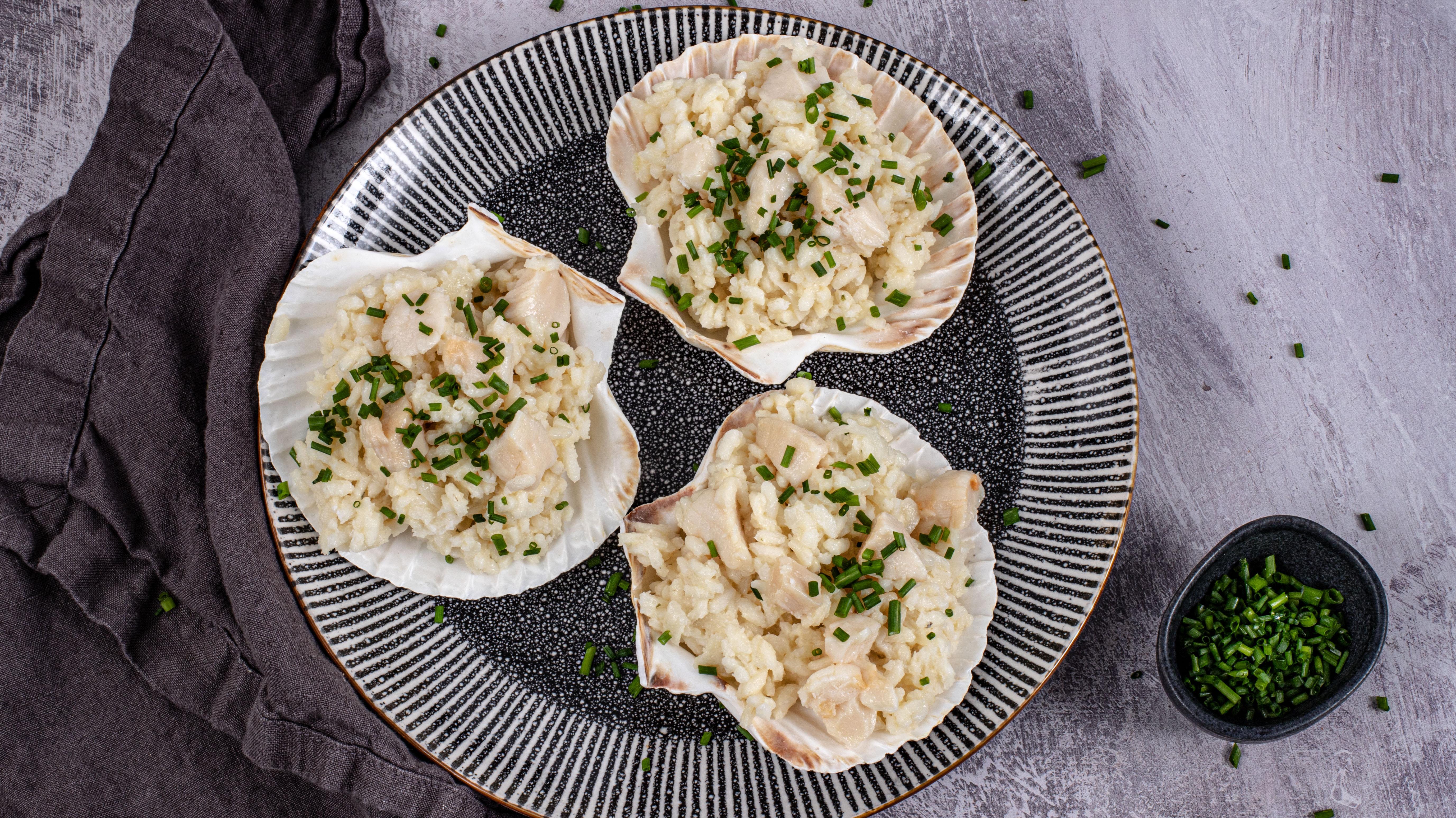 This risotto is simple to make but will impress. Serve in clean scallop shells.
