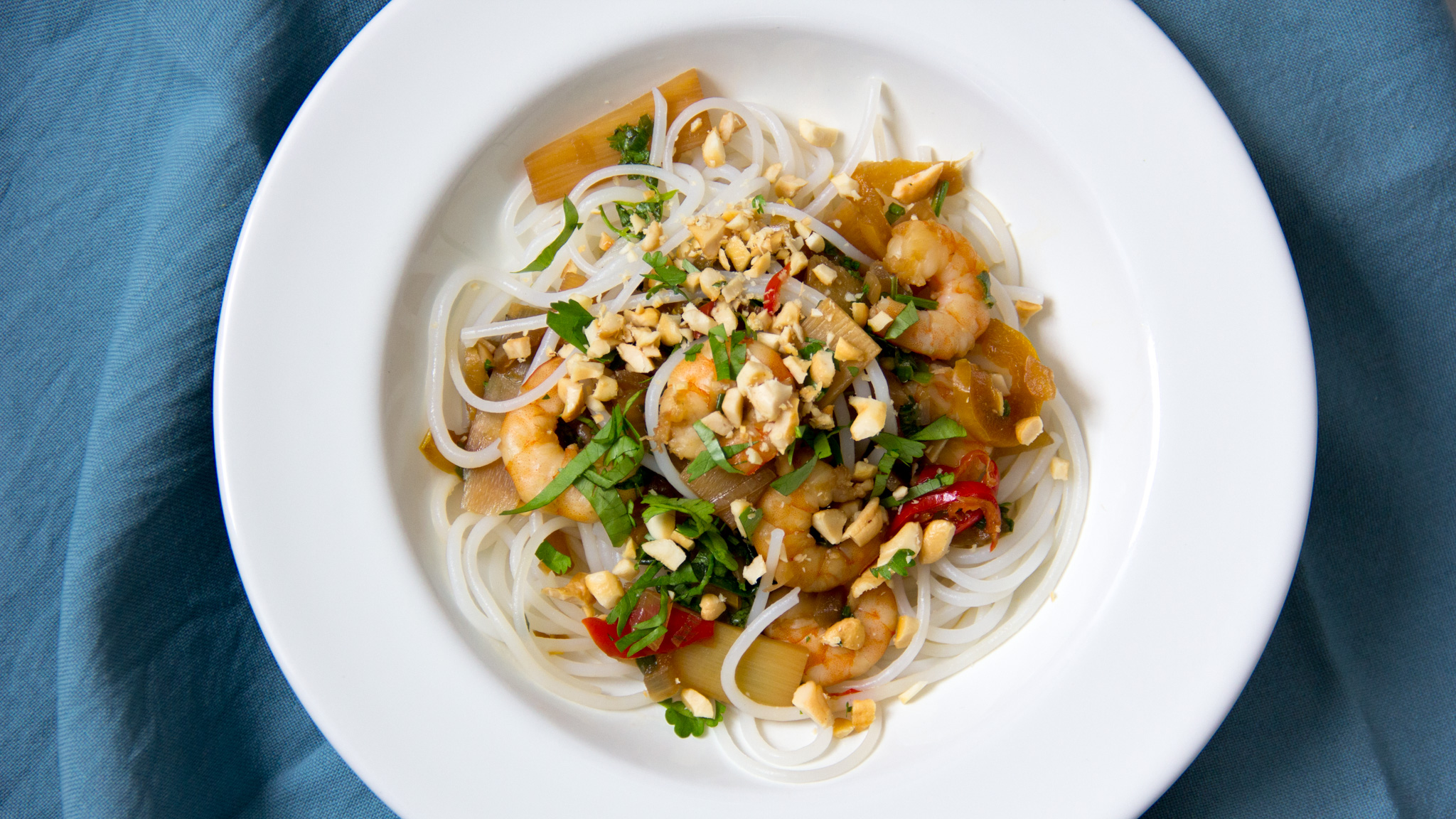 This is a quick and tasty stir fry dish served with rice noodles and garnished with chopped peanuts and coriander. This is the recipe for you, if your looking for something healthy, quick and delicious. Add more fresh chilli or a drizzle of chilli oil if you like more heat.