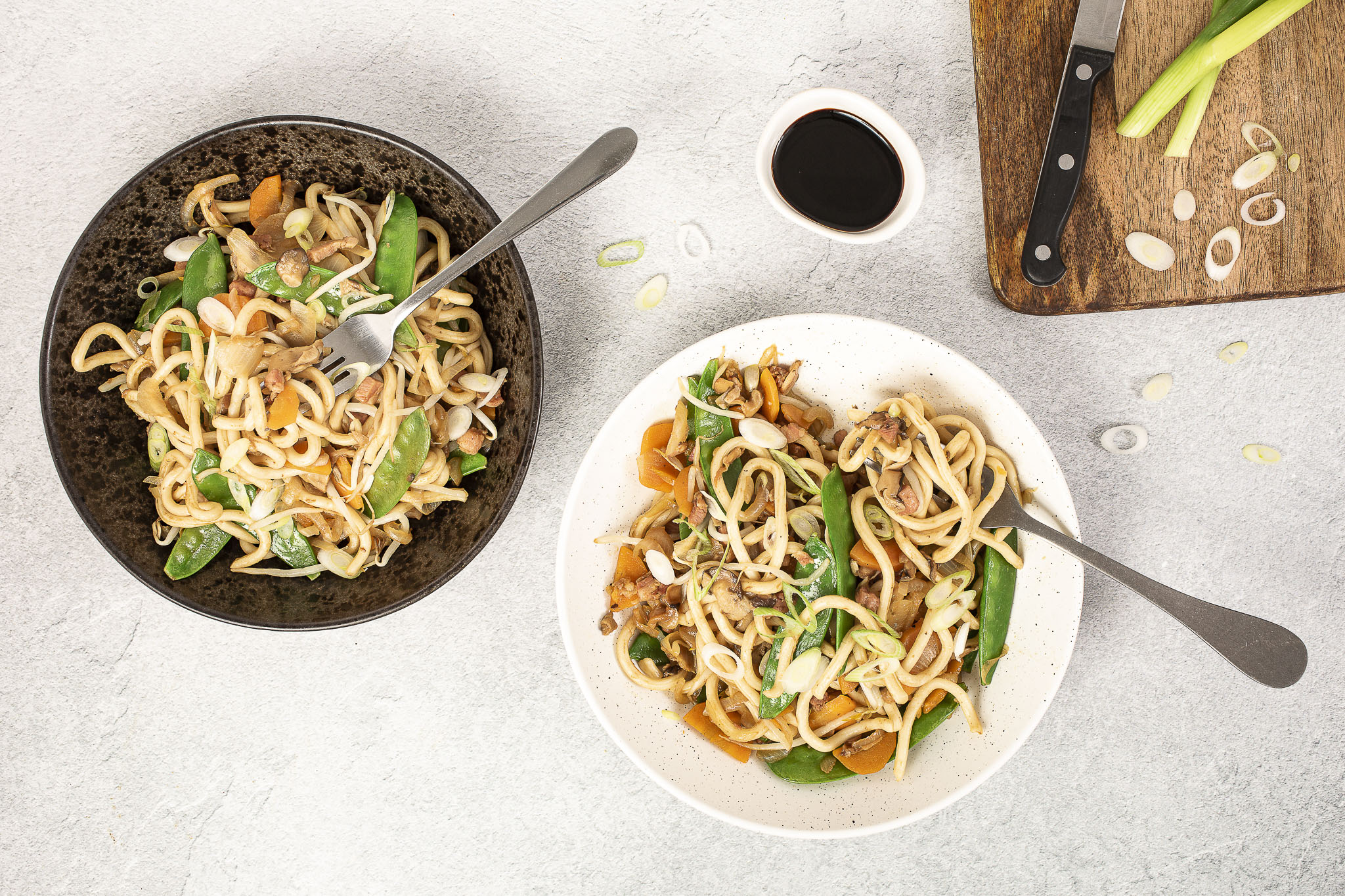 Yaki Udon is a tasty Japanese stir fry made with thick udon noodles, our recipe uses bacon however you can customise it to your liking (use cooked noodles not dried).