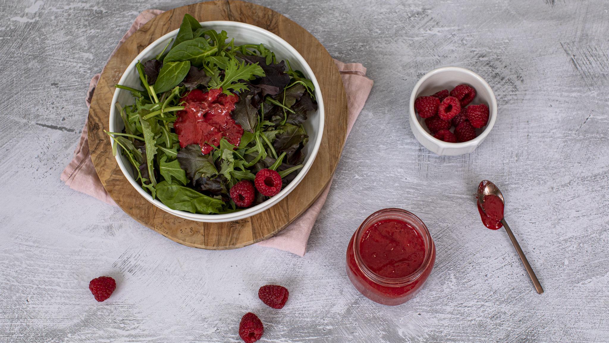 Use up any raspberries with this colourful salad dressing. This dressing goes great with nutty or spinach salads.