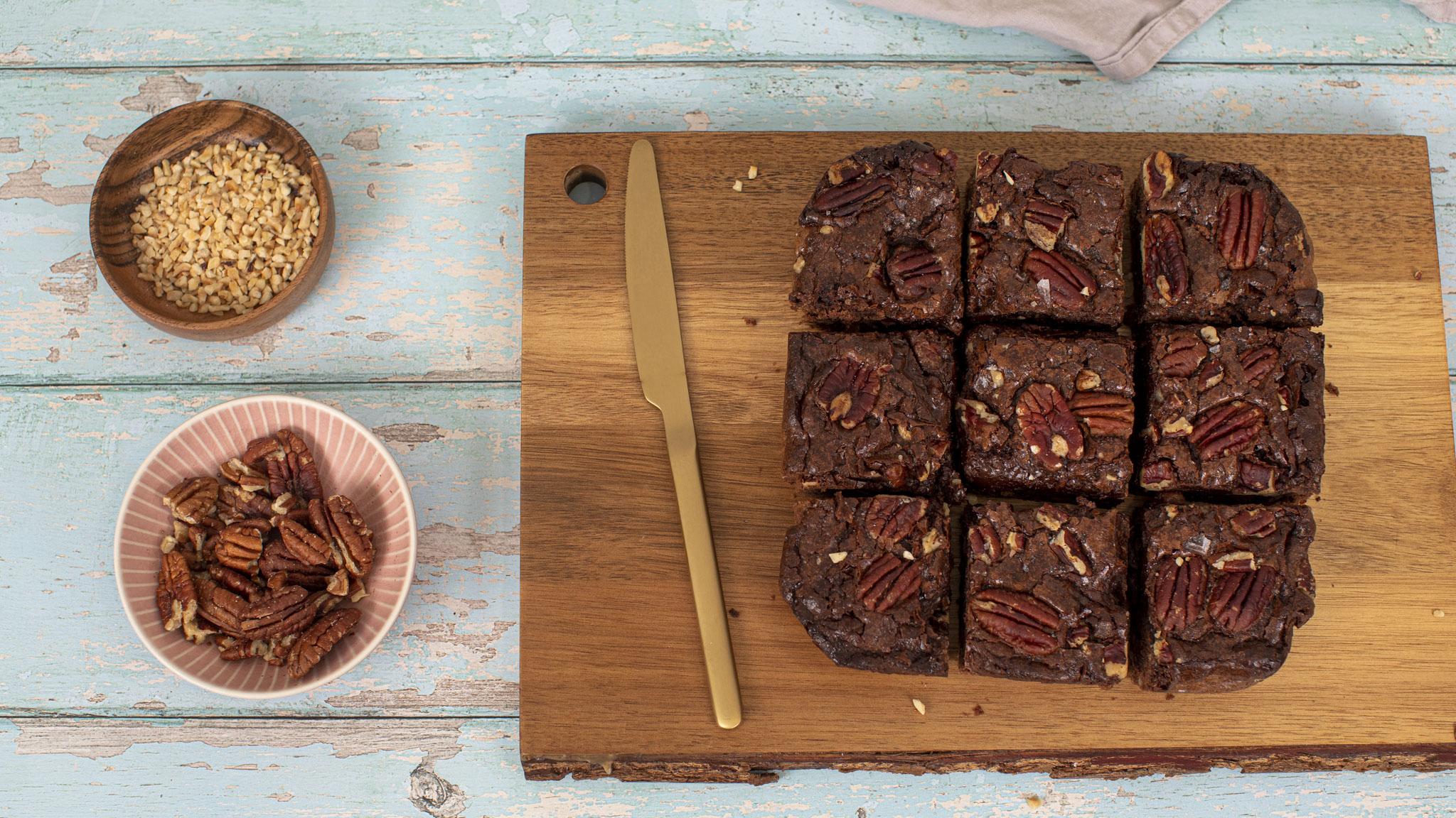 These super fudgy brownies are the perfect indulgent treat for any occasion. Moreish fudge brownies with rich hazelnut chocolate and finished with crushed pecans and sea salt. Serve with vanilla ice cream for a decadent dessert.