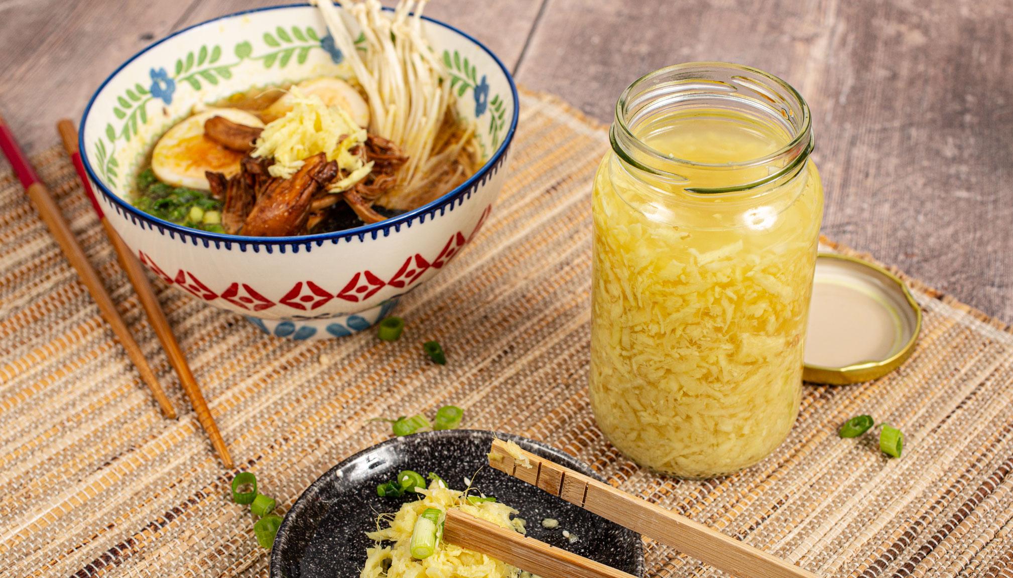 Sharp and hot, wasabi is added to the pickling liquid to create a spicy and refreshing Japanese-style condiment. Add in small doses to ramen bowls, hotpots, yakitori, or sushi. Once all the ginger has been used up, the leftover brine can be used to pep-up a salad dressing or even in a cocktail! Make sure your jar is sterilised by running through a dishwasher or rinsing with boiling water and drying in a very low oven.