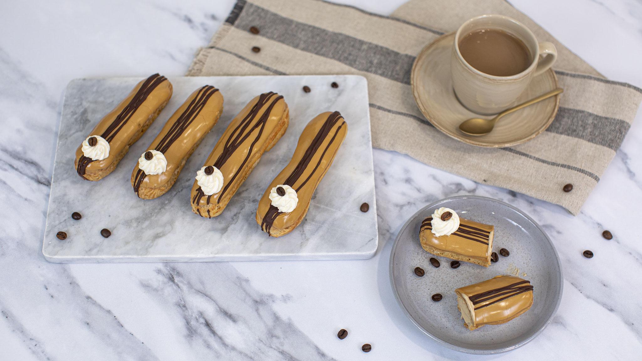 Eclairs are traditional French pâtisseries made of pâte à choux filled with crème pâtissière which can be flavoured with chocolate or coffee. Our éclairs are piped full of creamy coffee custard filling; not too sweet and with just the right amount of goodness, then glazed with coffee icing. Enjoy these coffee éclairs with a cup of coffee or tea.