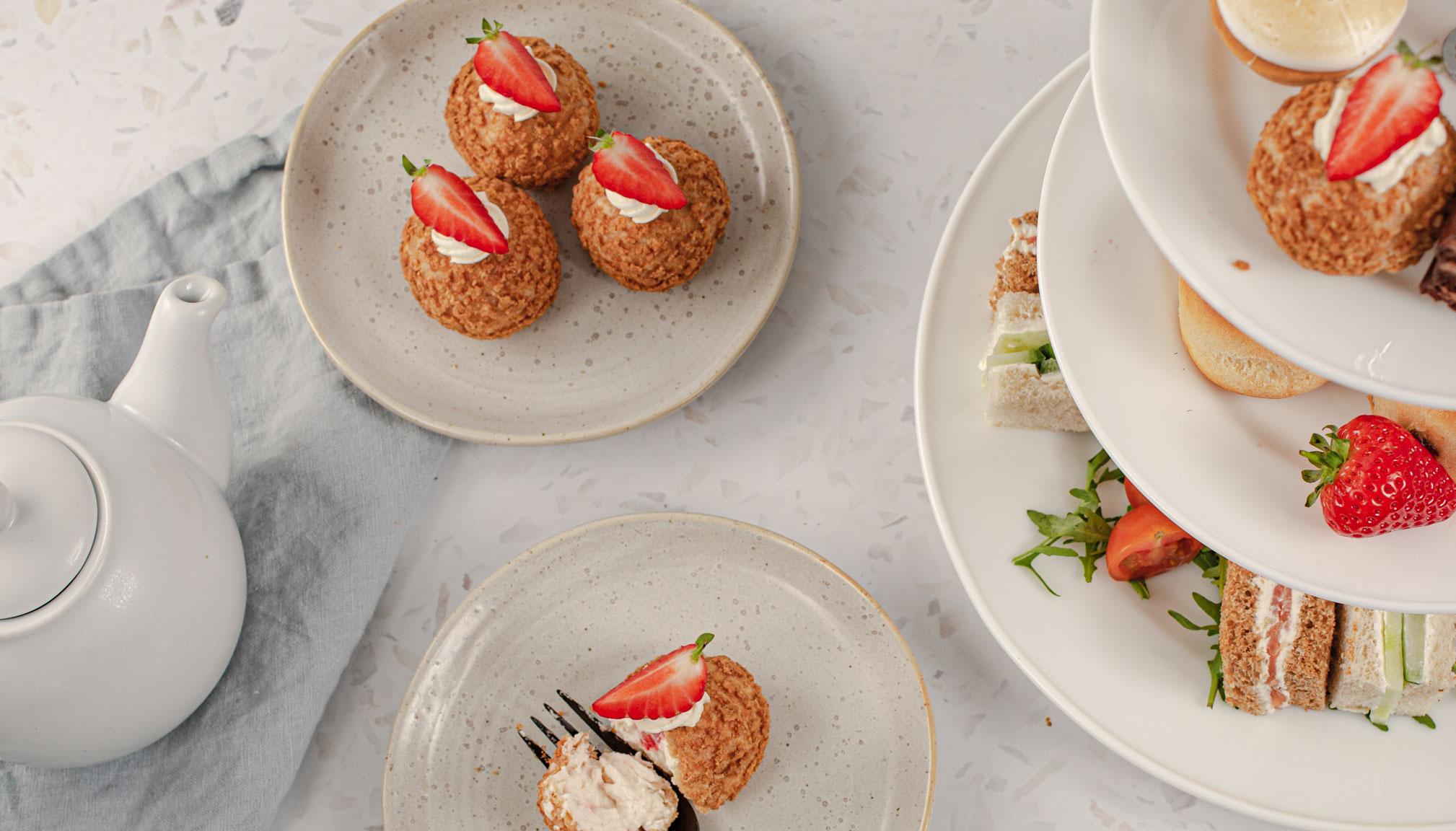 Impress your guests with this delicious crunchy choux bun recipe, made with a fresh strawberry and sweet cream filling. Perfect for an afternoon tea treat!