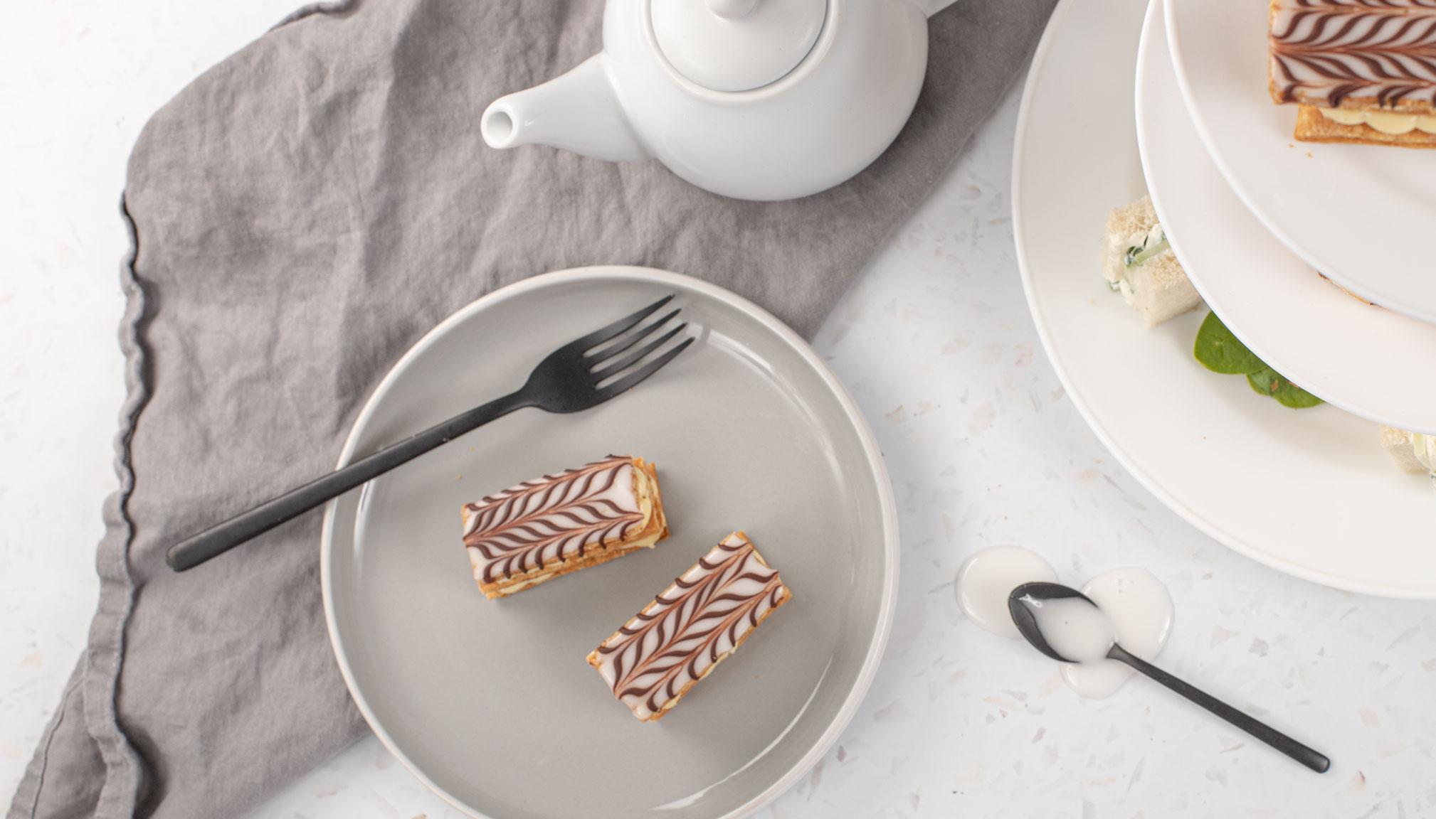 The mille feuille, or "thousand sheets" in French, is a classic traditional French dessert composed of three layers of light as air puff pastry filled with creamy vanilla pastry cream (crème patisserie) and topped with chocolate and vanilla icing. Try making this mini version to serve with your afternoon tea.