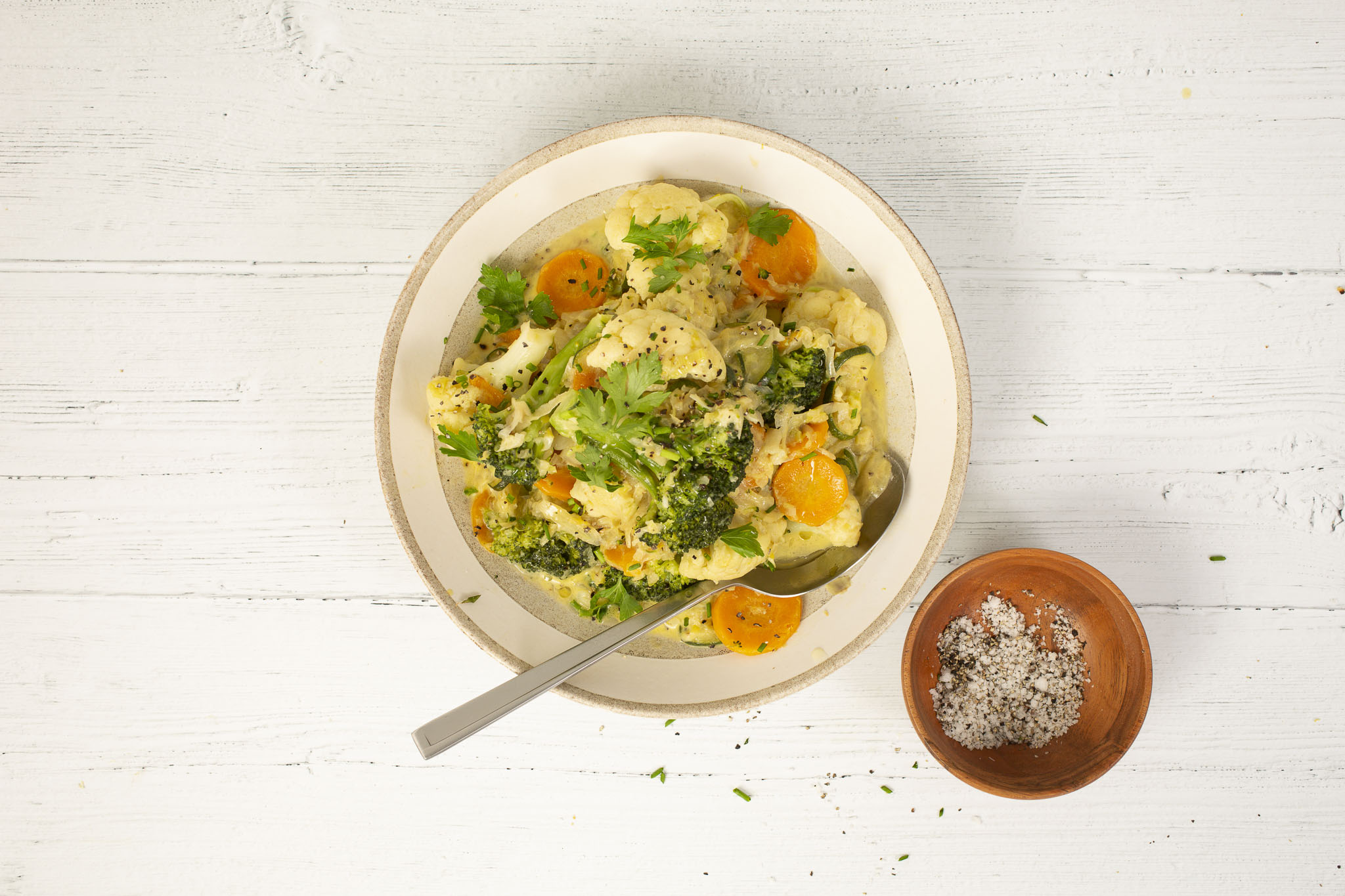 17. Then add single cream, vegetable stock, broccoli and cauliflower to the kCook bowl