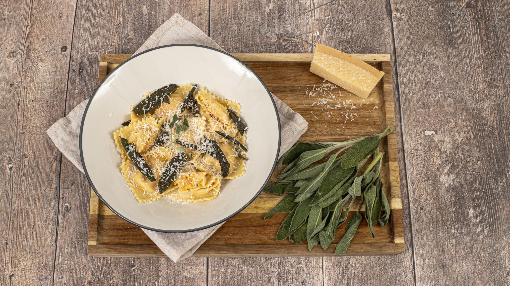 Pumpkin, sage and ricotta are a classic Italian flavour combination found in many traditional dishes, especially pasta. Here the pumpkin is roasted until golden and tender, then mixed with salty ricotta and woody sage until smooth to create a deliciously rich filling for plump ravioli. This is a great recipe to make and freeze half for a later date, simply freeze the uncooked ravioli in a single layer before transferring to a container for up to 3 months, then cook from frozen, adding 2-3 mins to the final cooking time. If you want to, you can form the ravioli by hand in the traditional manner, however a ravioli tray speeds things up and helps you make picture-perfect pasta every time.