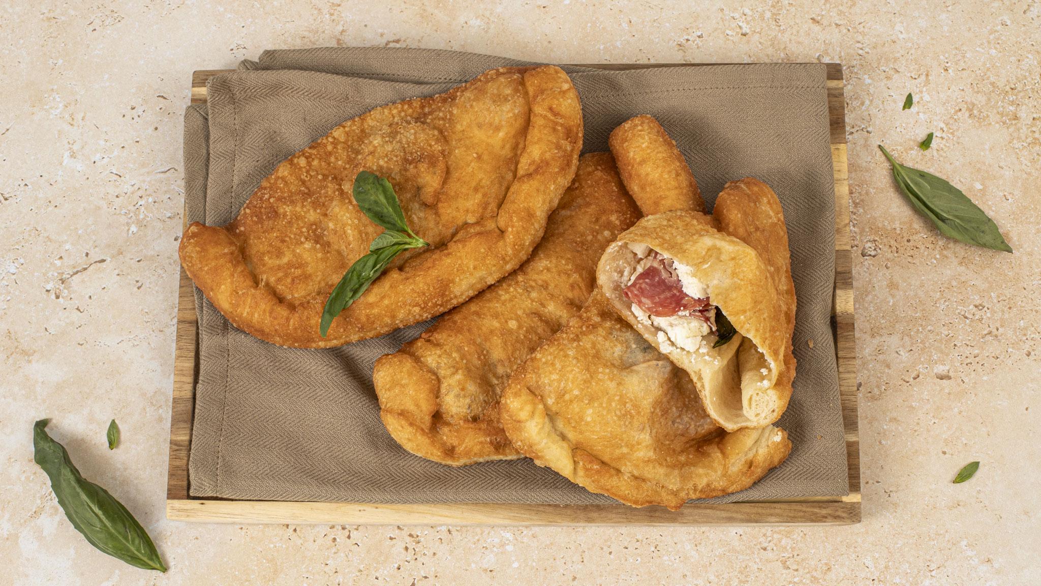 Invented in Naples after the Second World War, pizza fritta was a quick, easy, and cheap way of making and selling pizza when many of the city’s pizza ovens had been destroyed during heavy bombing. When traditional pizza-making ingredients such as mozzarella became very expensive, Neapolitans started to fill their pizza fritta with vegetable off-cuts, cheap cured meats, and ricotta (a by-product of mozzarella), to create a deliciously deep-fried pocket of salty soft cheese, fresh basil, and spicy cured meat.