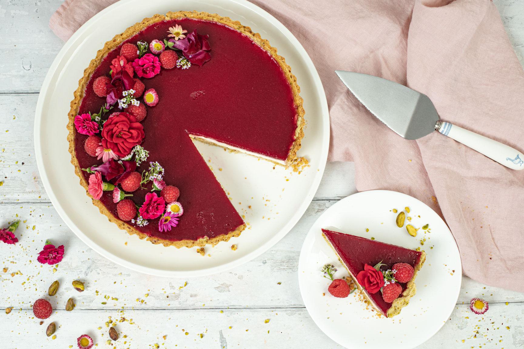 This pistachio tart filled with vanilla panna cotta and layered with raspberry jelly is a sophisticated and elegant dessert that is perfect for celebrating Mother's Day. The tart shell is made with a shortcrust pastry dough with ground pistachios. Once the tart shell has cooled, the panna cotta is poured on top and allowed to set. The raspberry jelly is made by simmering fresh raspberries with sugar and gelatin, then pouring it over the panna cotta layer. The result is a stunning dessert with layers of flavour and texture. Serve it with fresh raspberries and edible flowers on top for a beautiful and delicious treat that your mother will love.