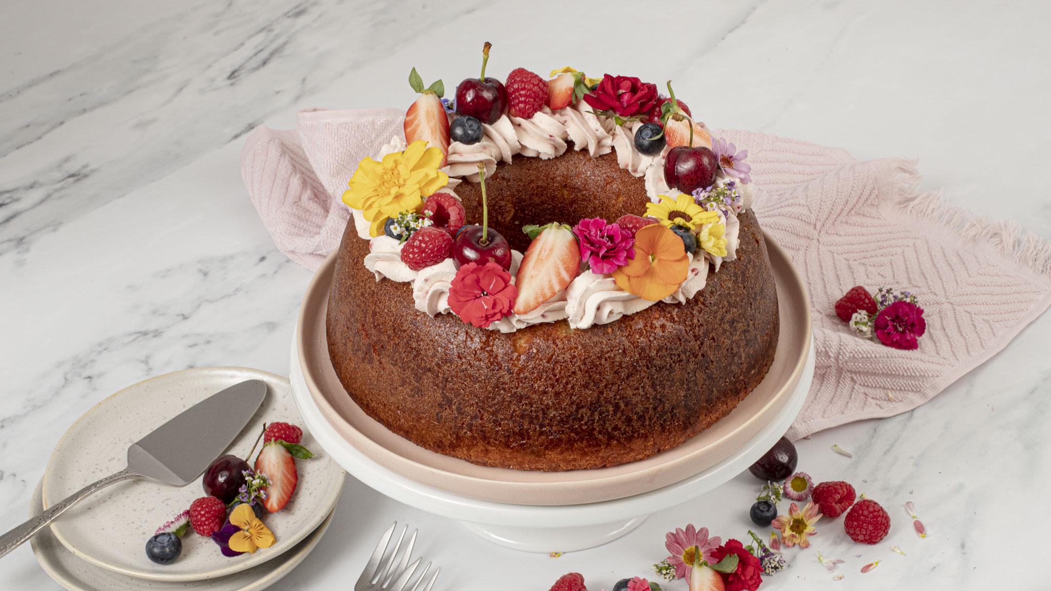 This savarin cake with raspberry cream is a delicious and impressive dessert that is perfect for celebrating Mother's Day. A savarin cake is a yeast-based cake that is soaked in a sugar syrup, giving it a moist and tender texture. Decorate the cake with fresh mixed berries, whipped raspberry cream and edible flowers, and you have a beautiful and delicious dessert that is sure to impress your mother on her special day. This recipe does not contain any alcohol, however, if you prefer a liquor-soaked savarin, simply add 100ml of any liquor of your choice when making the sugar syrup.