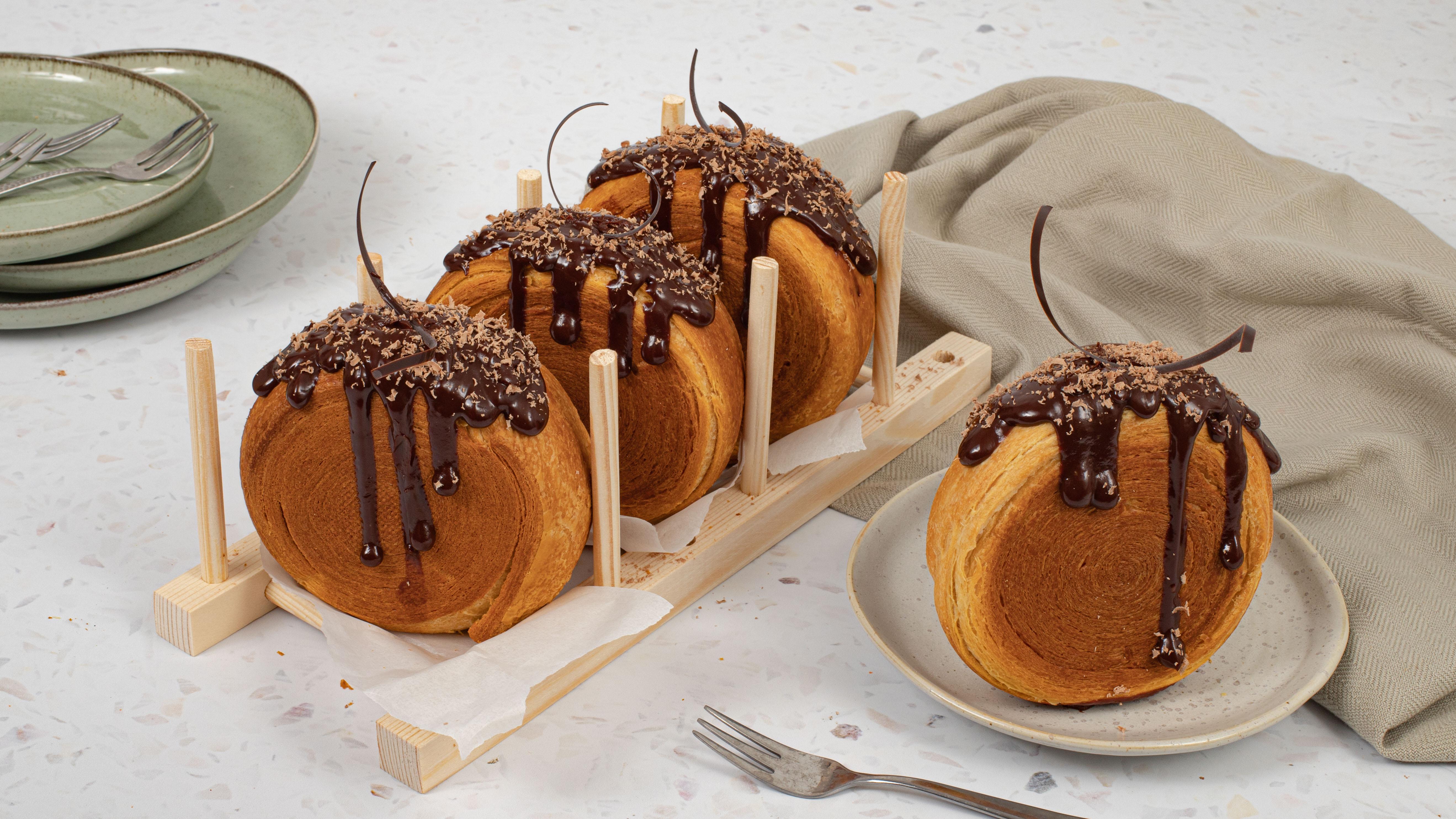 Step into pastry paradise with the New York Roll, also known as the Supreme Roll. This pastry masterpiece begins with a croissant dough that is expertly moulded into a perfectly round shape, then baked until it achieves a golden, flaky crust and a pillowy-soft interior. It is then filled with velvety rich chocolate pastry cream and finished with smooth chocolate ganache for a super indulgent pastry treat. To make this recipe you will need 12 cm x 4 cm moulds.
