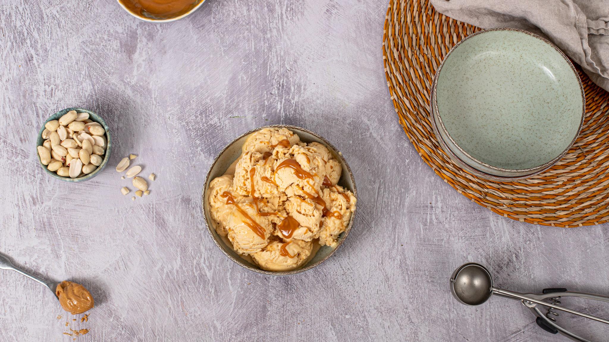 A creamy, nutty treat. Why not try swapping the caramel for chocolate sauce or even white chocolate chunks. Remember to place the bowl in the freezer 24 hours in advance.