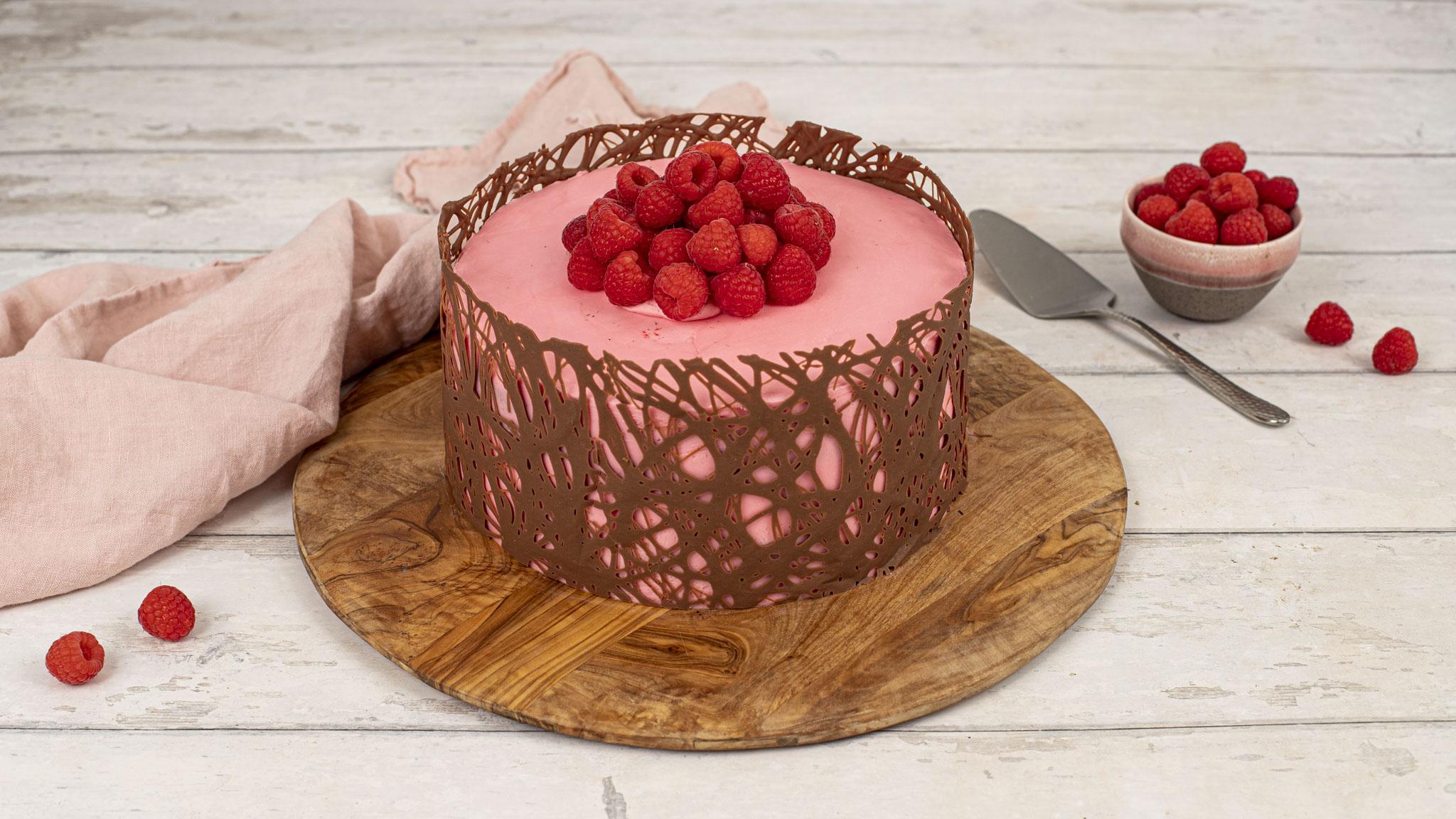 Indulge in a divine chocolate cake adorned with pink buttercream, milk chocolate lace, and raspberries. The rich, moist chocolate cake is lavishly coated in velvety pink buttercream, while delicate milk chocolate lace gracefully drapes along the sides. Fresh raspberries add a burst of tangy sweetness, creating a symphony of flavours. This visually stunning and irresistible creation promises a heavenly dessert experience.