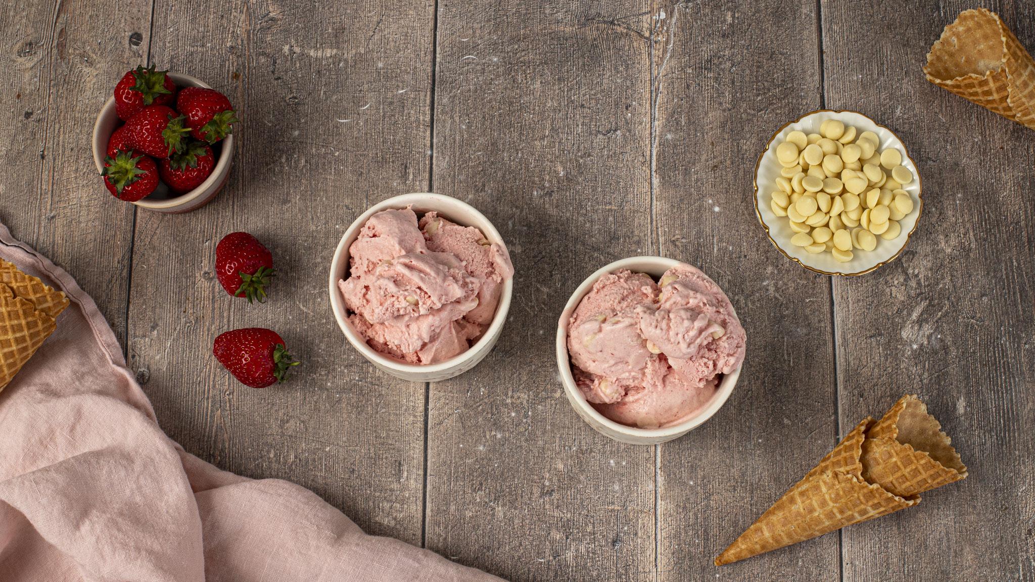 Flavoured with summer strawberries and white chocolate, this quick ice cream recipe is made with only five ingredients, perfect for cooling down on a hot summer’s day. Serve immediately or freeze until needed (up to one month) and simply re-blend until soft.