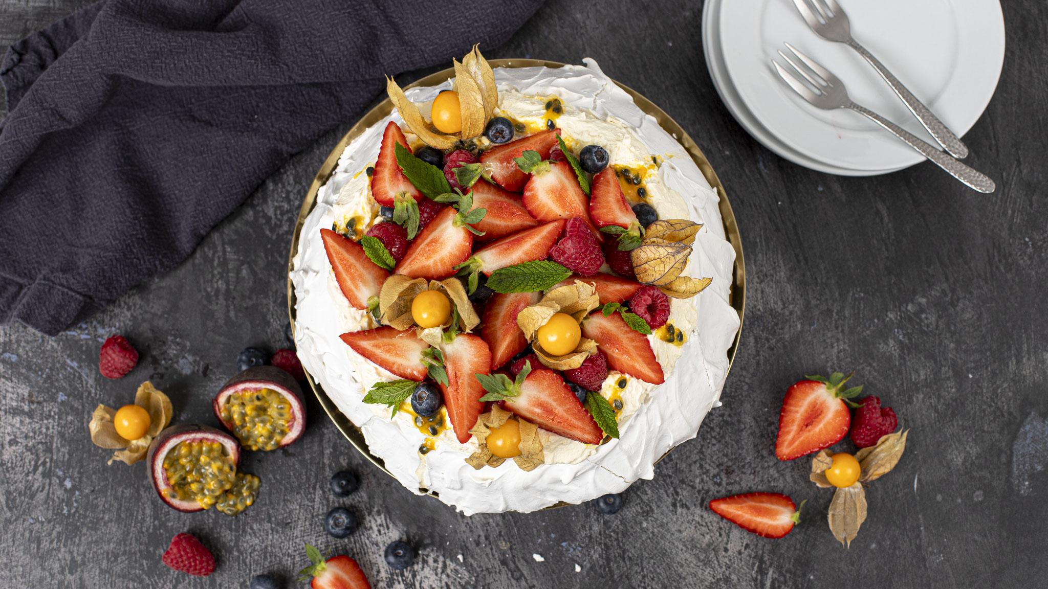 Pavlova is a beloved dessert that consists of a crisp and delicate meringue shell, topped with whipped cream and an assortment of fresh fruits. The meringue shell is made by whipping egg whites and sugar to create a light and airy texture, which is then baked until it becomes crisp on the outside. Once cooled, the pavlova is generously topped with whipped cream and a colourful array of fruits, such as strawberries, raspberries, and passion fruit. The combination of the crunchy meringue, smooth cream, and juicy fruits offers a delightful contrast of flavours and textures. Pavlova is cherished for its elegant presentation and the harmonious balance it achieves between sweetness and lightness. Whether enjoyed at special occasions or as a personal indulgence, pavlova remains a timeless dessert that captivates dessert lovers with its beauty and deliciousness.