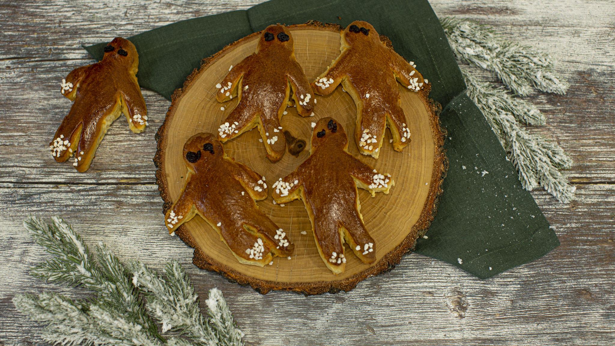 These fun breads are served on St Nicholas Day in Germany - 6th December - in little boots filled with treats and small gifts if you've been good. They are traditionally baked with small oven safe clay pipes which are available online outside of Germany and decorated with pearl sugar 'gloves' and 'boots'. Try using a large gingerbread man cutter or draw a template 15- 20 cm long to cut around.