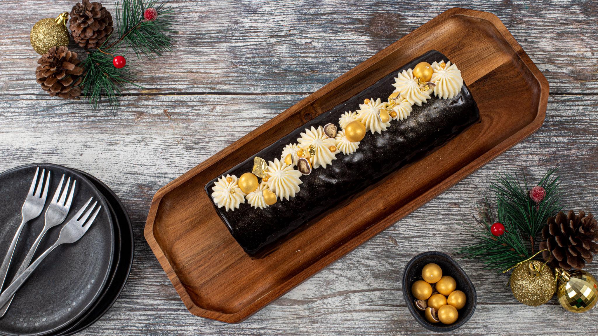 A Chocolate Mirror Glazed Bûche de Noël is a traditional French Christmas dessert. It features a sponge cake rolled and shaped like a Yule log, filled with creamy chocolate ganache. The mirror glaze is made with chocolate, sugar, and cream, creating a smooth reflective surface on the cake. The dessert is visually stunning and has a balanced, decadent chocolate flavour that makes it perfect for impressing guests or enjoying with loved ones.