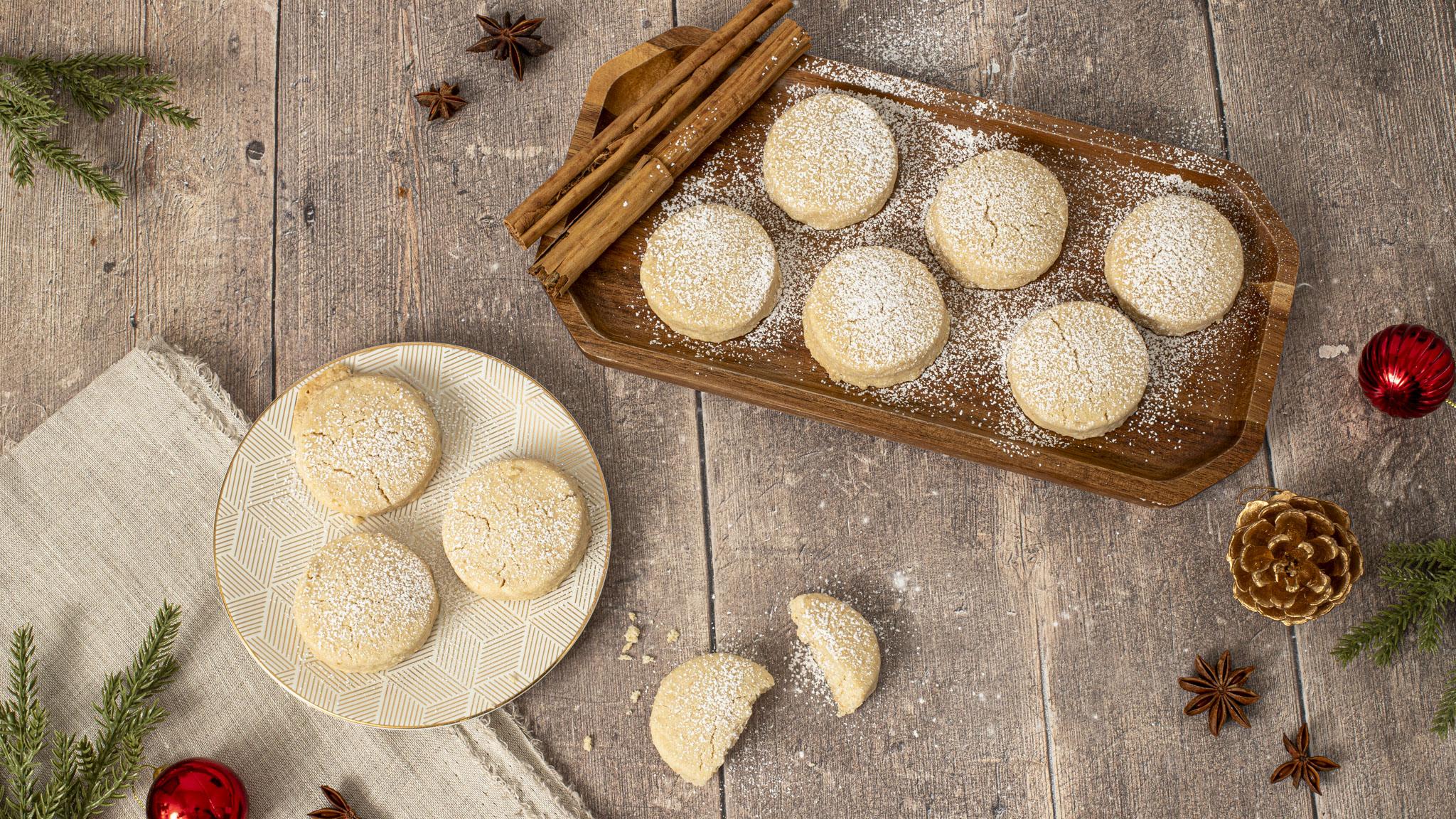 Polvorones are a crumbly biscuit simply decorated with icing sugar.