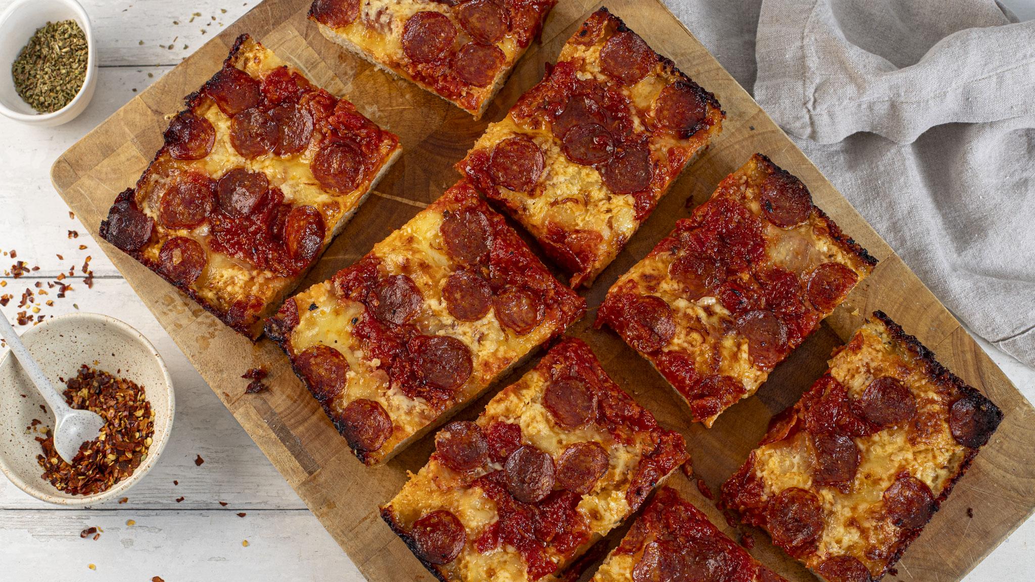 Similar to focaccia, Detroit style pizza has a light, spongy base, which is topped with layers of oozing cheese and salty pepperoni. The sweetened tomato sauce is added in three long stripes, as is traditional, and the result, baked in a pan until golden, bubbling, with crispy cheese edges, is delicious. In Detroit, Wisconsin brick cheese is used but can be hard to find elsewhere, so we have used a mix of mozzarella and cheddar to achieve the same rich and tangy flavour. For best results, use a pizza stone and reduce the cooking time by 5 minutes.