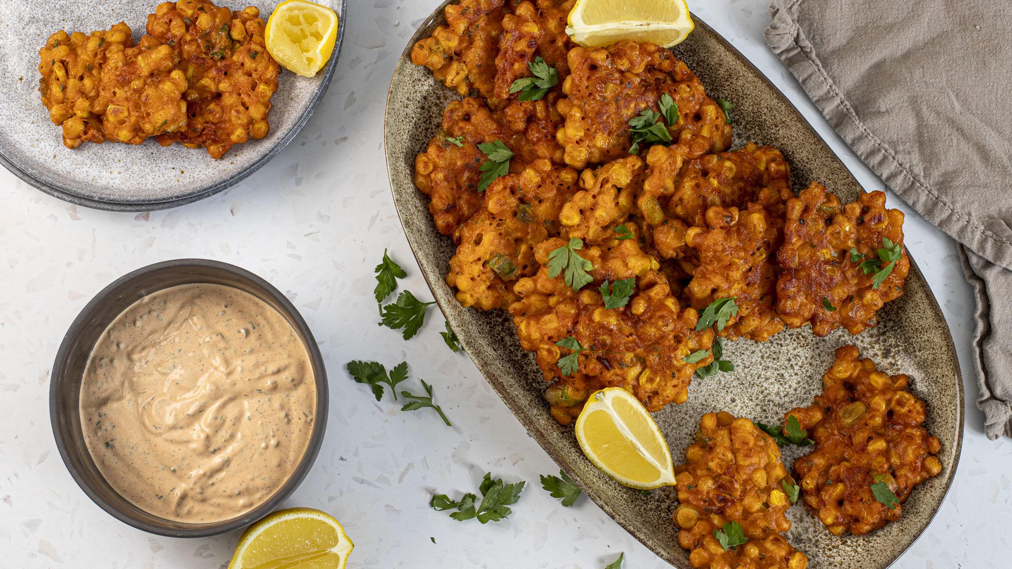 Sweet, spicy, and crisp, these delicious fritters are a great snack for all to share, served alongside a fresh and creamy take on ranch dip.