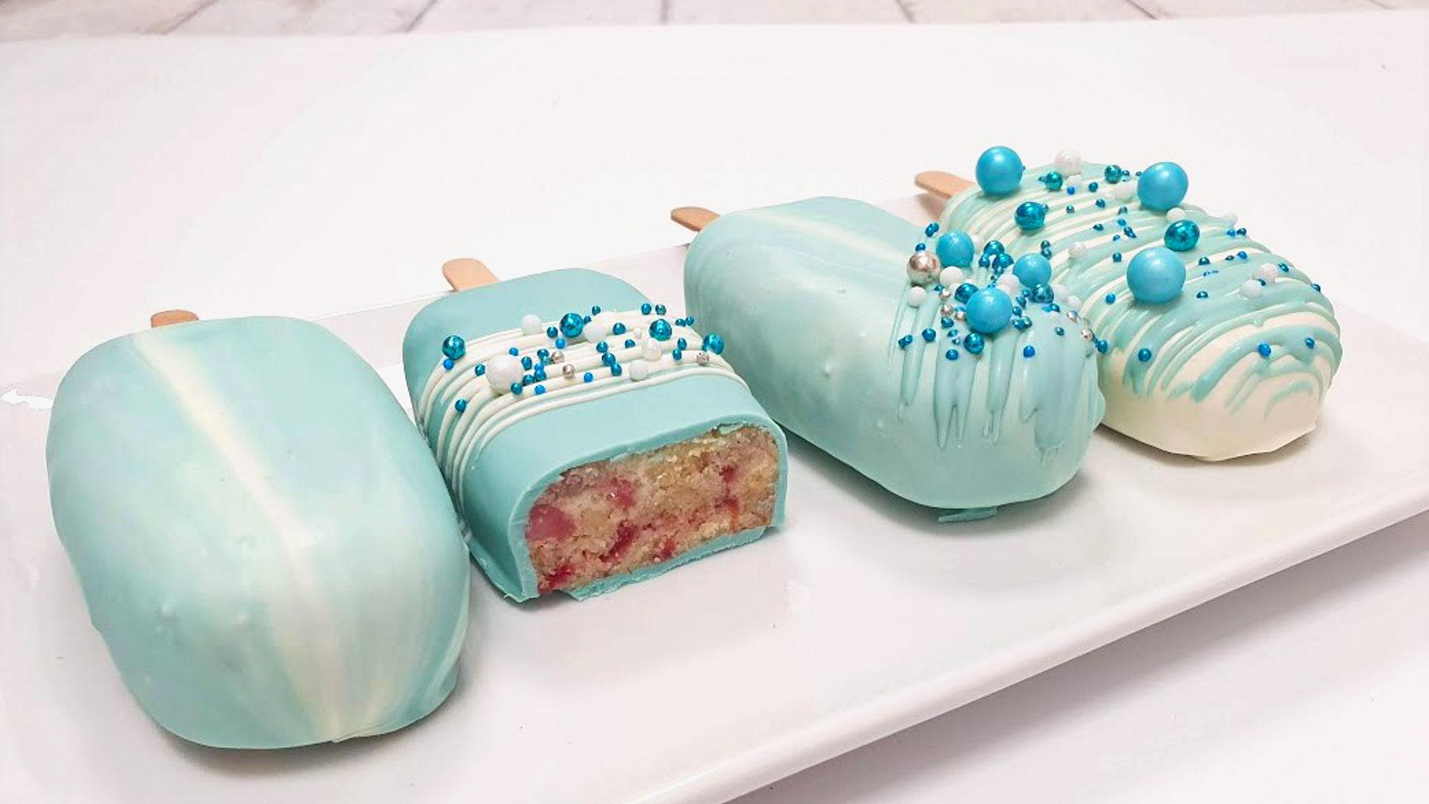 These raspberry cakesicles are miniature desserts made by moulding a mixture of vanilla and raspberry cake into popsicle shapes, inserting a stick, and dipping them in blue candy melt. The cakesicles are then decorated with colourful sprinkles, creating a fun and playful treat. The combination of vanilla, raspberry, blue candy melt, and sprinkles results in a delicious and visually appealing dessert, perfect for any occasion or as a sweet snack. Candy melts are available to buy online or at cake decorating supplier shops.