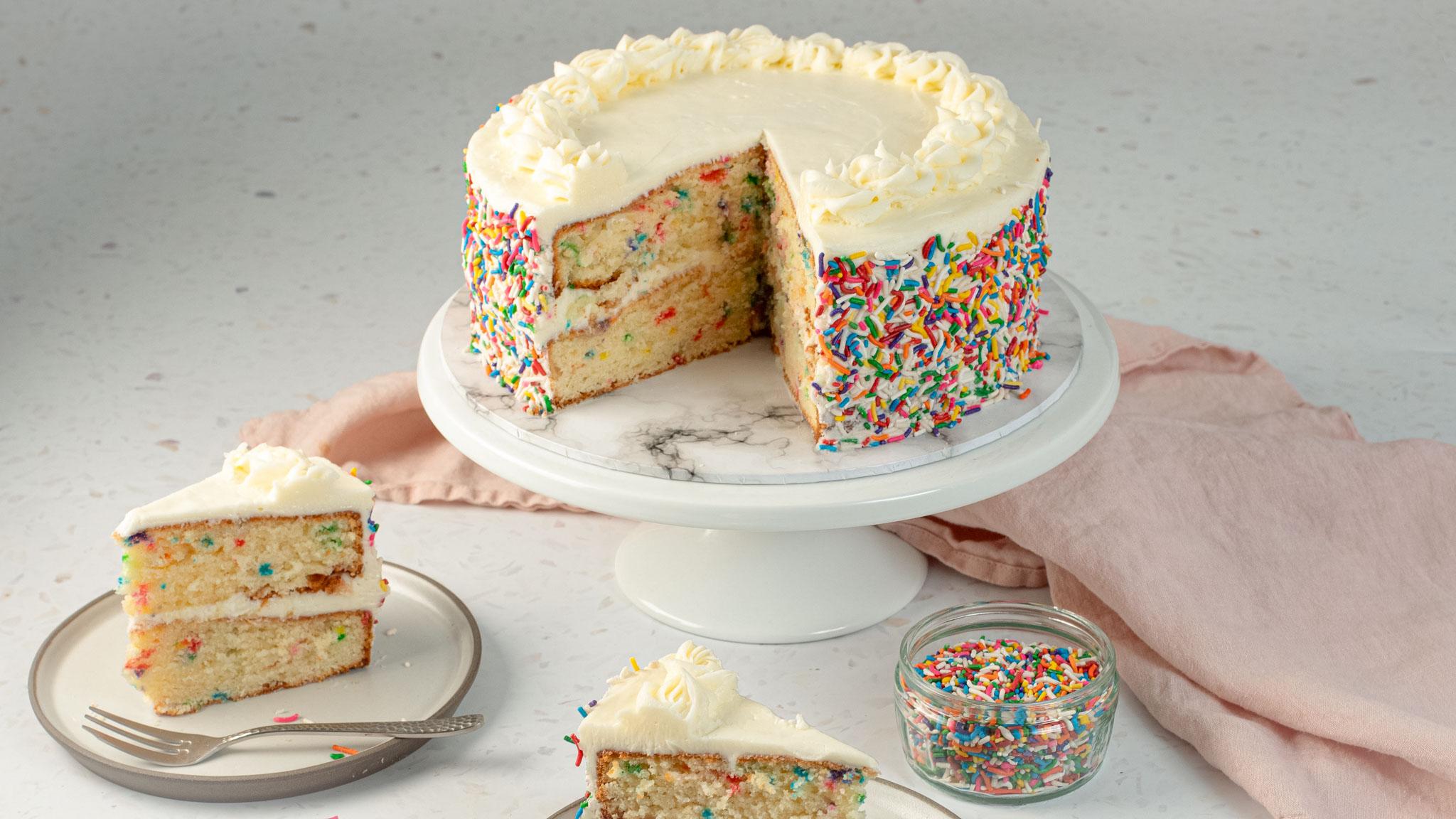 Introducing our colourful Sprinkle Celebration Cake, the perfect treat for all your celebratory moments! This colourful cake is a true crowd-pleaser, boasting a vibrant array of sprinkles that add a burst of joy to every bite. Whether you're celebrating a birthday, anniversary, graduation, or any occasion, our Confetti Cake is the ultimate choice. It features two tiers with rainbow sprinkles baked right in the sponge and is generously frosted with a velvety vanilla cream cheese frosting. Make every occasion extra special with our Sprinkle Cake recipe.