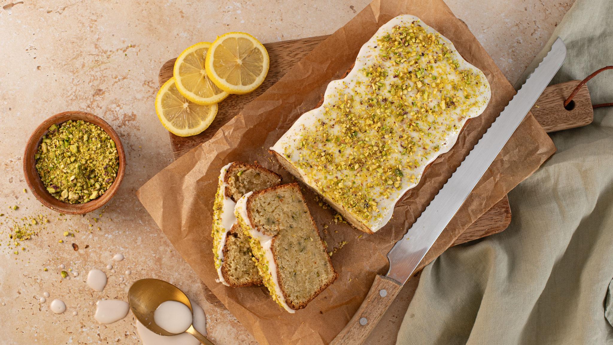Use up any leftover courgettes and reduce food waste by making this delicious and flavourful vegan loaf cake drizzled with a tangy lemon icing and finished with a crunchy pistachio topping for some added crunch. This cake is dairy-free, egg-free, and is suitable for vegans. Store it covered at room temperature for up to three days.