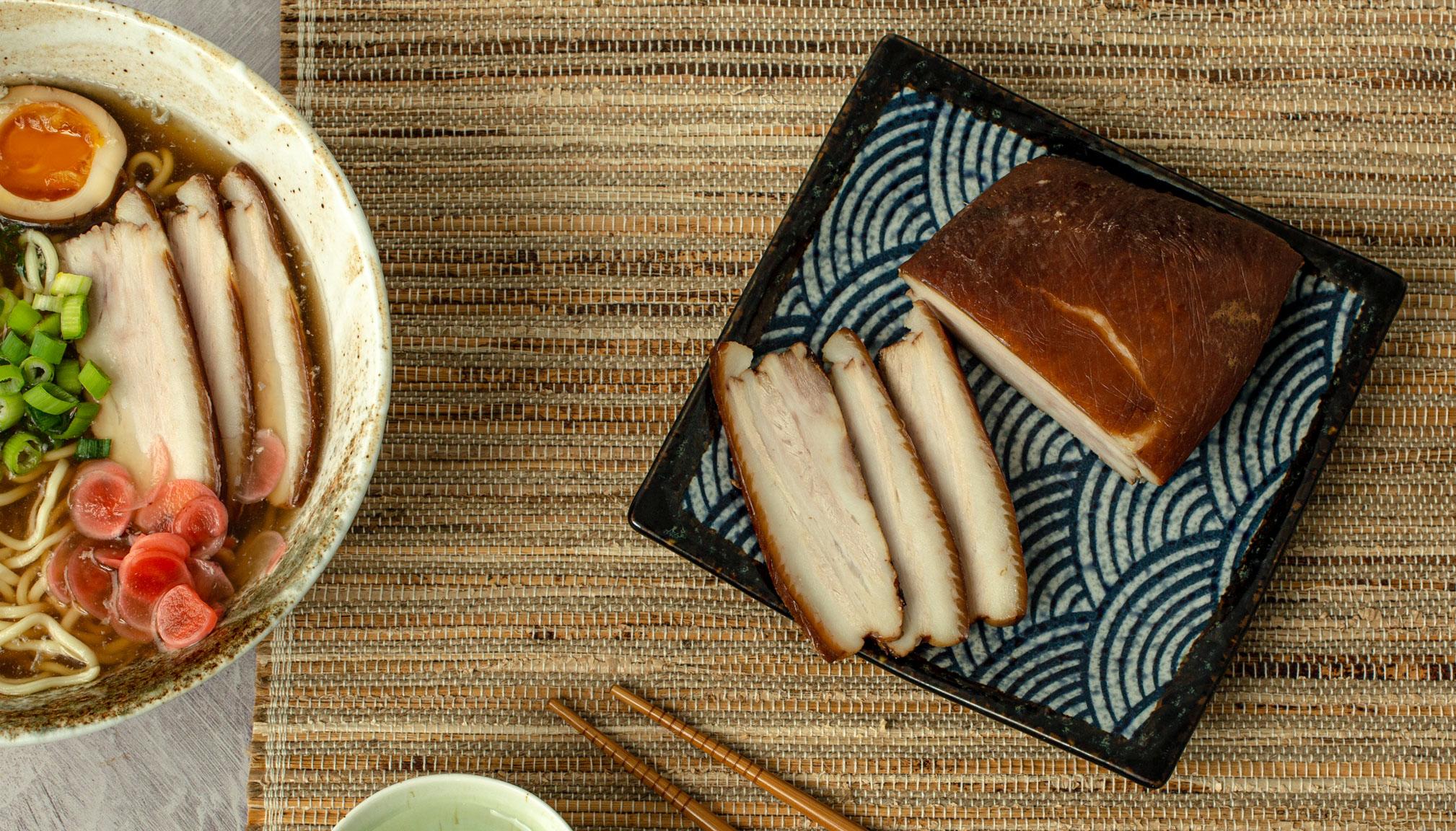 The perfect topping for ramen, pork chashu is sweet, salty, fatty, and – if fried before serving – sizzling and crispy. The pork is slowly braised in a mixture of traditional Japanese flavours, softening the pork fat and leaving the meat really tender. To ensure the meat cooks evenly, try to remove it from the fridge an hour before cooking to bring it up to room temperature. Once the pork has been braised and cooled to room temperature, wrap in clingfilm or foil and place in the fridge with a chopping board on top. Place something heavy, such as a sturdy pan or container filled with water, on the chopping board to compress the pork as it chills overnight. The pork chashu will then be ready to top any ramen bowl of your choice, and, as previously mentioned, can be sliced and fried in a pan before serving if you prefer it golden and crispy. If your braising liquid doesn't cover the pork in the bowl, top up with a little water until covered by at least 2cm.
