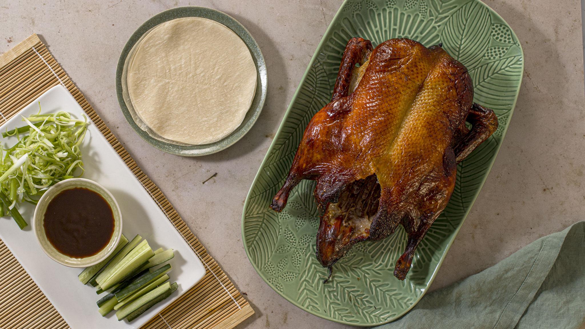Peking duck is one of the most famous dishes of Chinese cuisine, and this recipe makes it incredibly easy to get that golden, crispy skin at home without any of the special equipment restaurants use. Once cooked, shred the duck, and serve alongside Chinese pancakes, julienned spring onions and cucumber, and plum sauce, as is traditional.