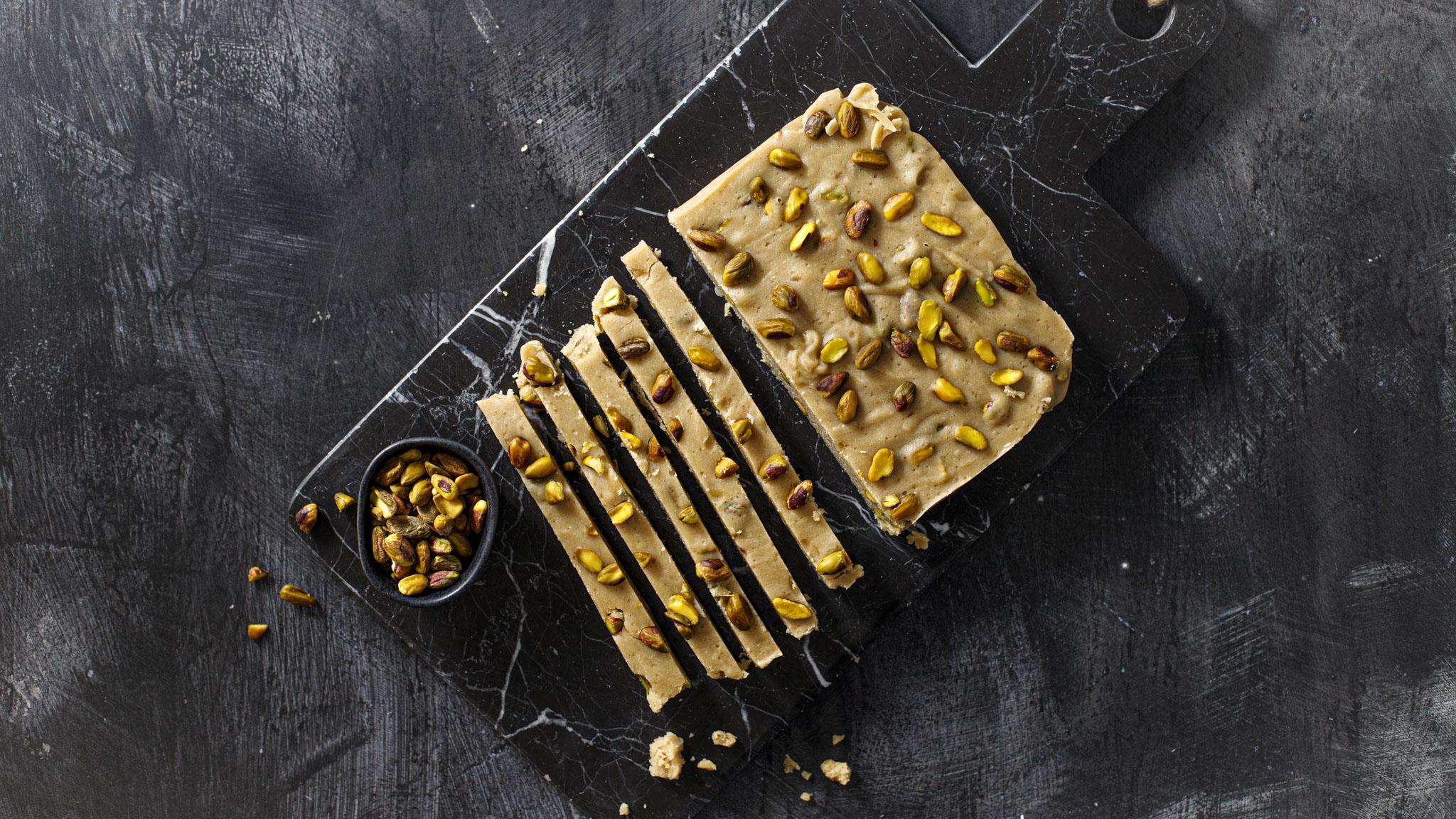 Halva is a deliciously simple sweet snack to make and can be made with an array of flavours and toppings. This version features fragrant cardamom and nutty pistachios.