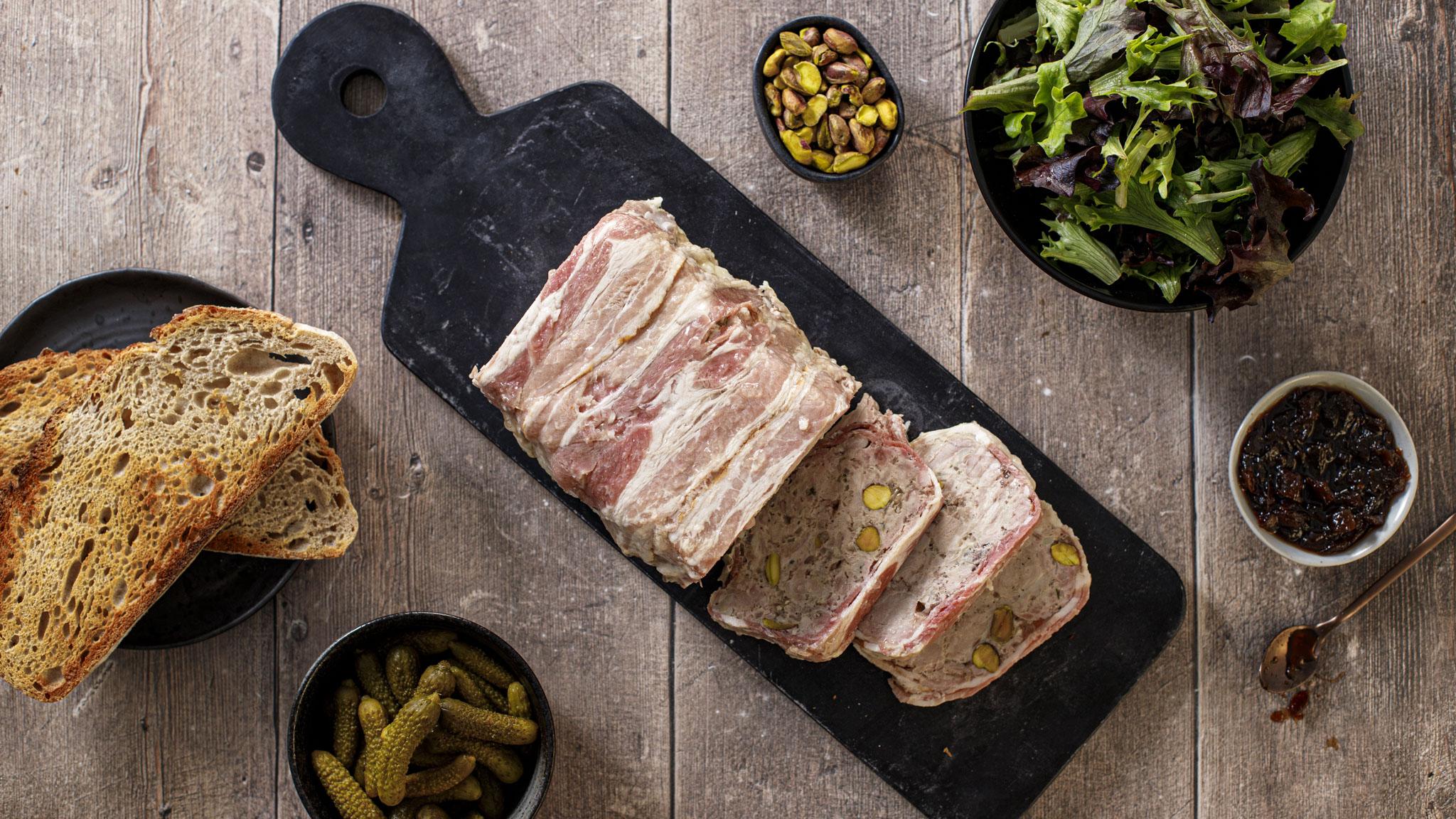 Making a terrine is a fantastic way to preserve food and prevent waste, ensuring your food goes further. As the fat is rendered during cooking it rises to the surface and seals the delicious rabbit, pork and pistachio terrine inside, allowing this recipe to keep, sealed and refrigerated, for up to two weeks. To serve, cut the terrine into slices and serve alongside a few lightly toasted slices of rustic bread, cornichons, and chutney for spreading generously.