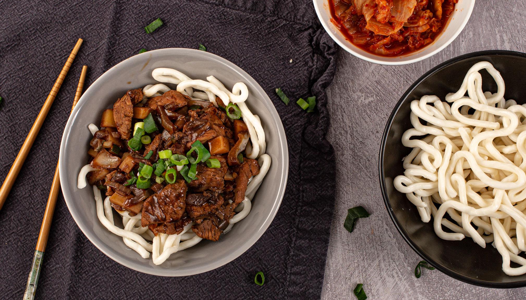 Black bean paste was first introduced to Koreans by China at the start of the 20th century, and is now used to celebrate Korean Black day, where those who weren’t able to celebrate Valentines day with a partner eat these noodles and commiserate each other. The fermented paste gives a big hit of salty, savoury flavour, and the addition of cabbage, courgette and potato makes this a great nutritious meal.