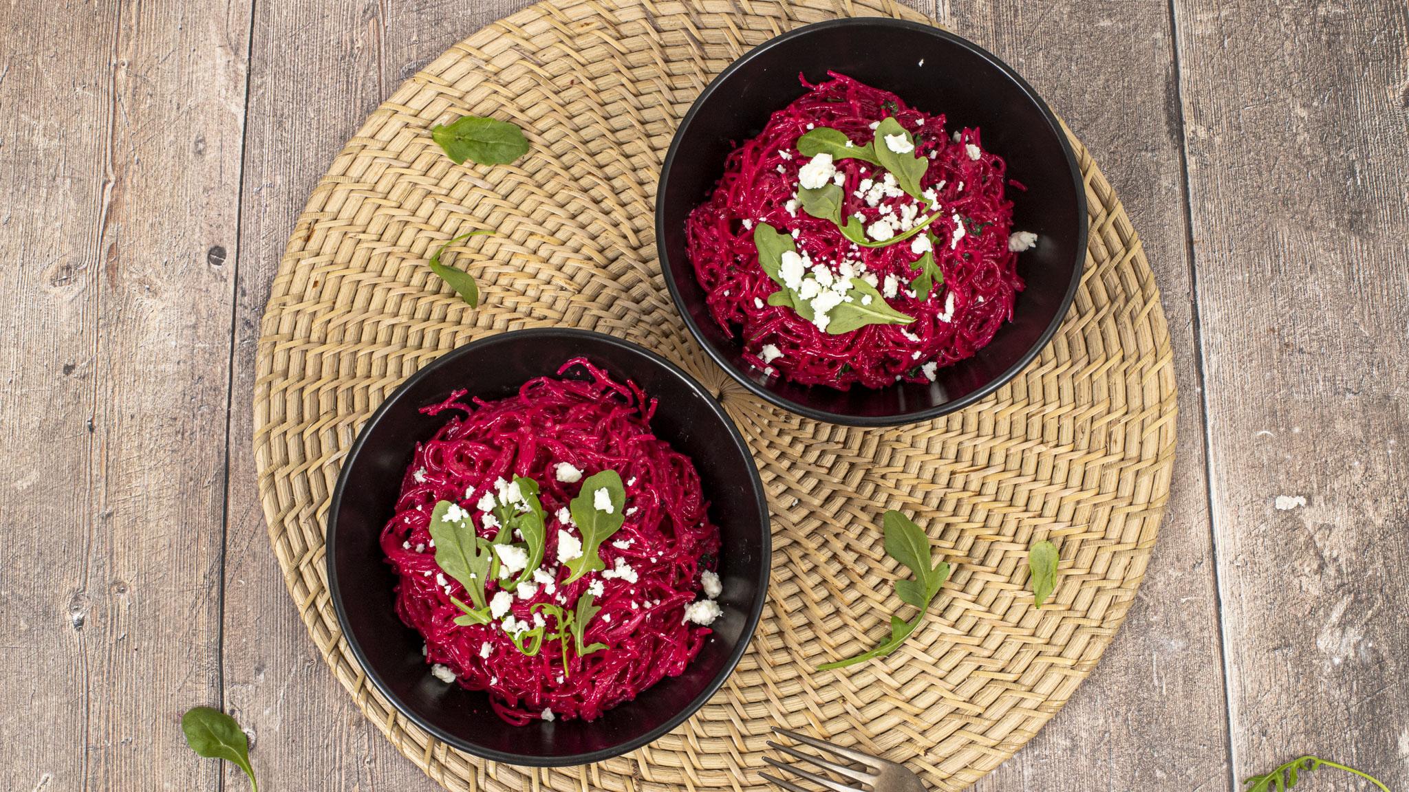 Bright and earthy, this pesto made from roasted beetroot, pine nuts, garlic and lemon gives the pasta a vibrant purple colour and makes a delicious alternative to the classic basil pesto. Fresh beetroot can be replaced with cooked beetroot and skip the beginning cooking steps. If you don’t need to use the full amount of pesto made, freeze any leftovers in a sealed container for up to three months. Just defrost overnight in the fridge and add to cooked pasta as needed. Appliance: MultiPro Go