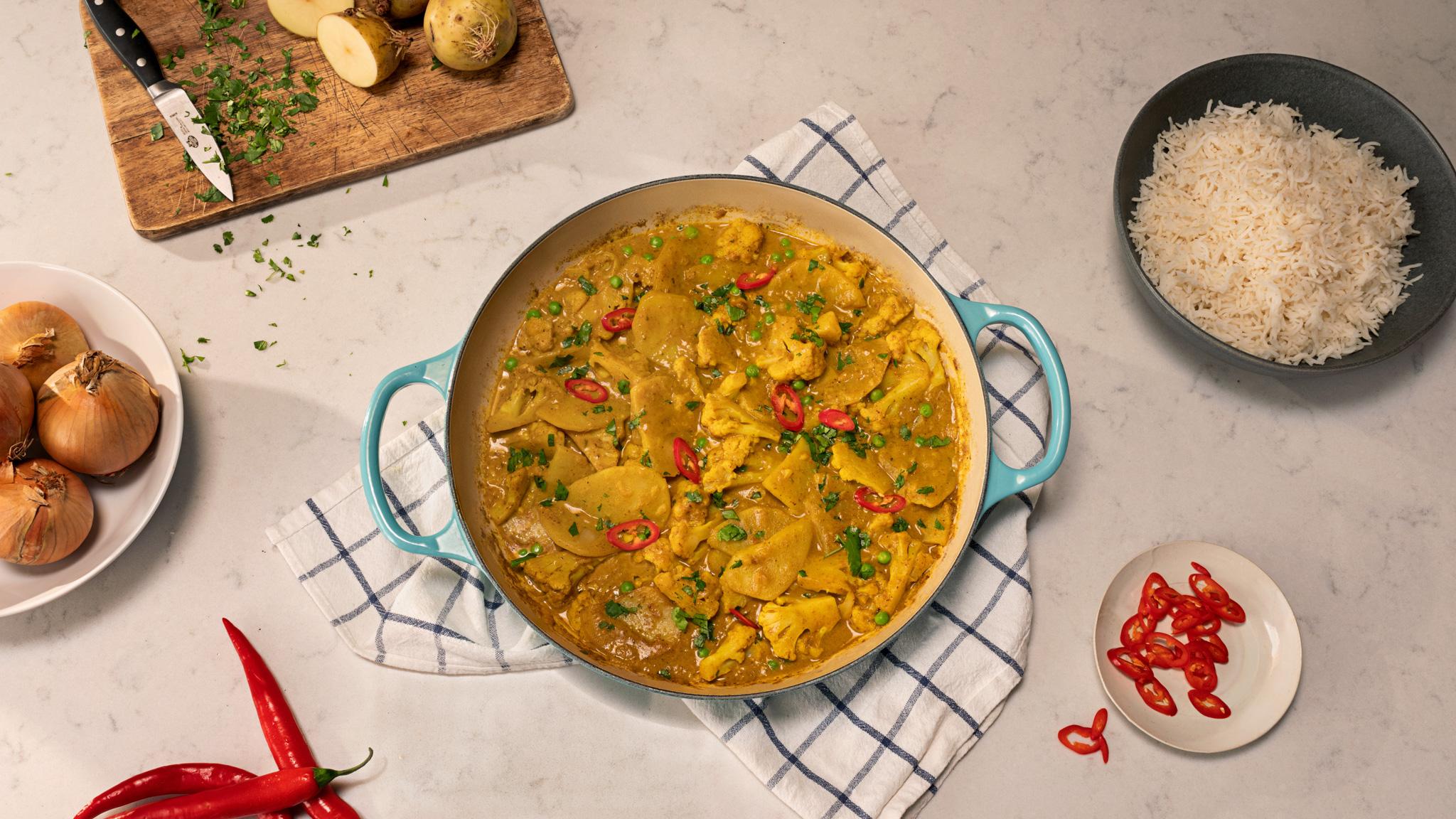 A quick and simple curry recipe for using up the leftover potatoes in your kitchen. If you also have a handful of cherry tomatoes or a salad tomato lurking in the fridge, roughly chop and add this also. Serve with rice or a 50/50 mixture of rice and lentils for added protein. If you have fresh coriander remove the leaves and reserve them for garnish before finely chopping the stalks in the food processor bowl. Add the chopped stalks into the curry with the stock and coconut milk for a flavour boost. If the potatoes have started to sprout simply use the pointed end of your vegetable peeler or a teaspoon to remove and discard them before peeling - the potatoes are still good to eat, so don’t discard them. Appliance: MultiPro Go
